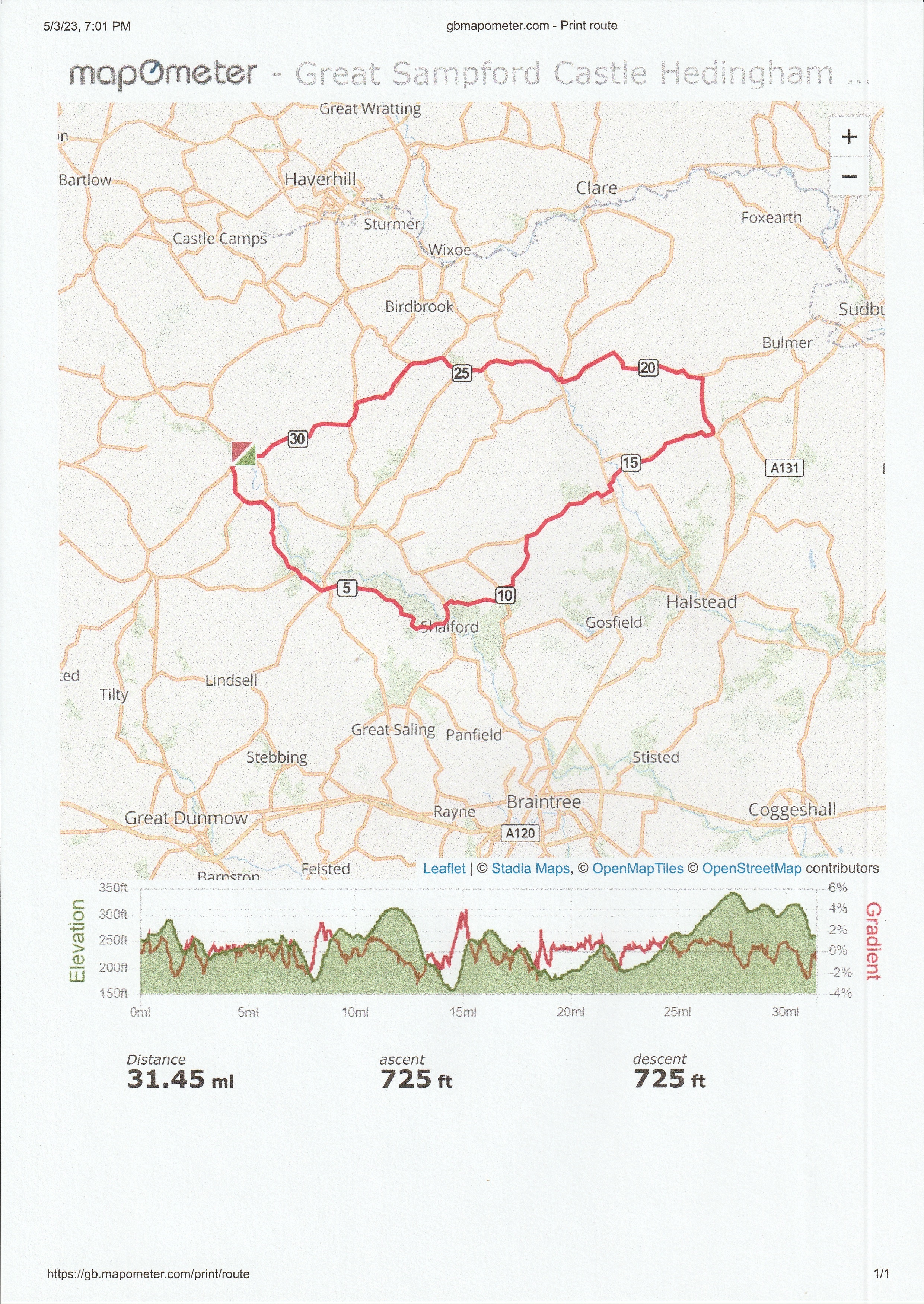 27 April. Gastronomic ride around Essex lanes. 32 miles.