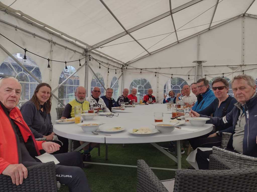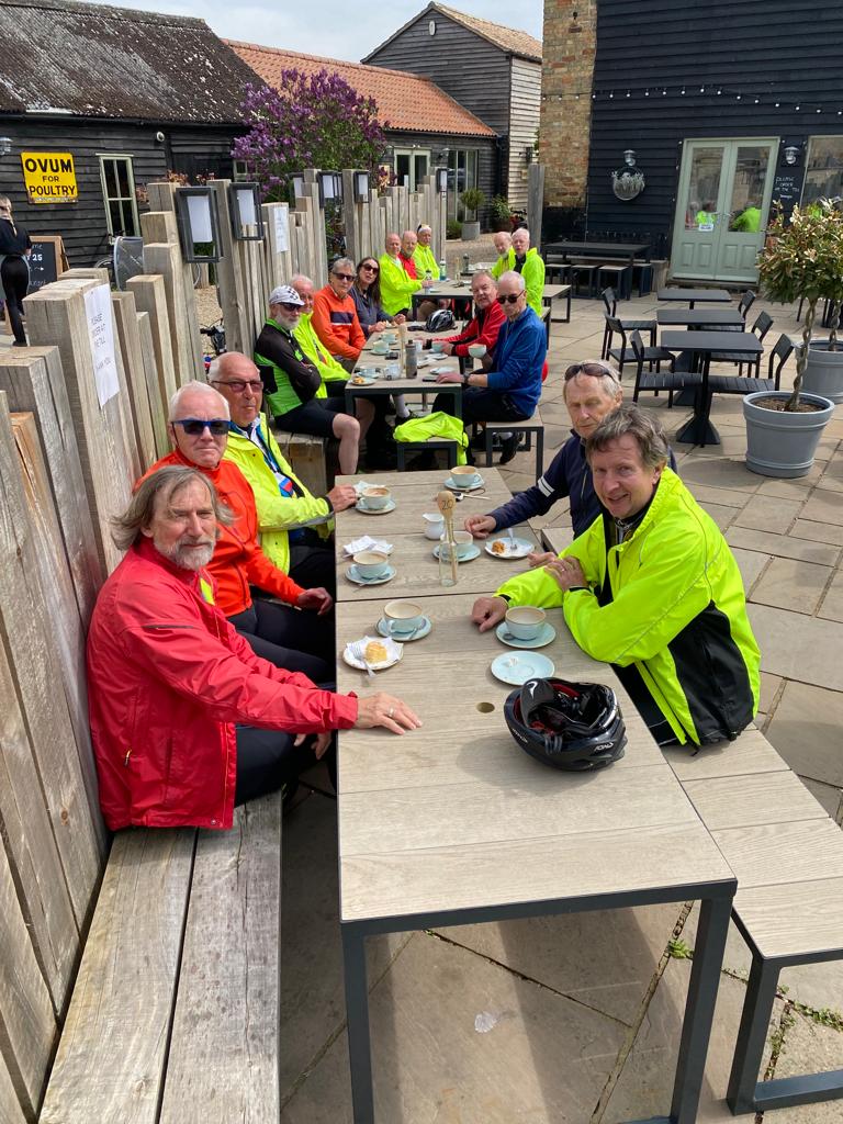 A brief detour via Rampton and we were on course for the Auction House cafe in Willingham. Willingham Auctions was established in 1959, and ran as a popular Auctioneers and Estate Agents for 25 years. It was reopened in 1994. The café is now a justifiably popular part of the site. Somewhat delayed for coffee, however, was the second group on the road due to an unfortunate puncture to Charles’ bike. Not having his usual e-bike meant that his full bag of bike spare paraphernalia and electronic gadgetry wasn’t there when it was needed and the puncture took a long time to fix ! By the time we were finally all assembled for coffee, the sun was out and we could all relax in the courtyard enjoying the warmth – just as well as the sudden influx of 19 riders had put the café into temporary overload and drinks and cakes were a while in arriving !