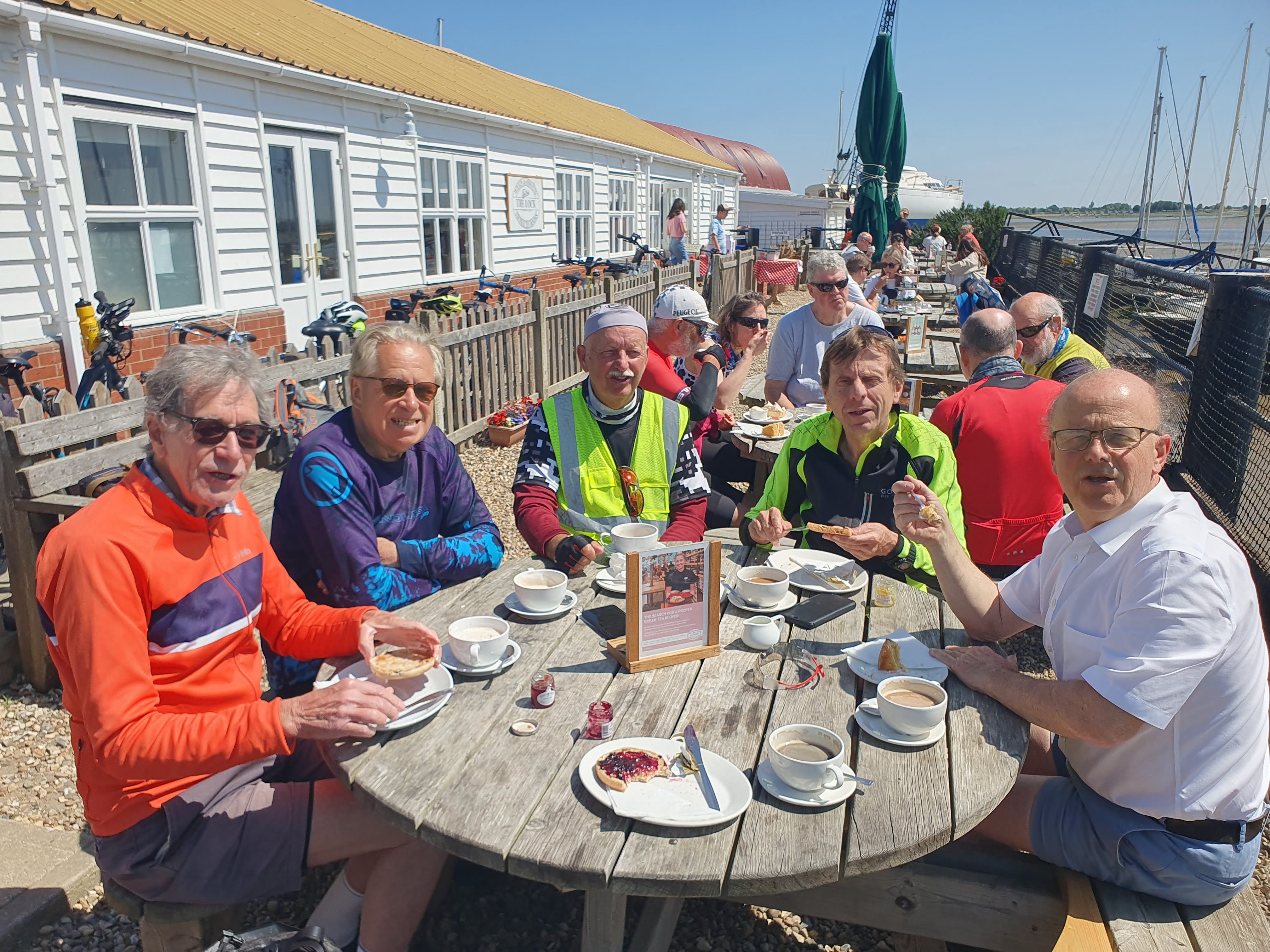 So, looking forward to a long overdue and, hopefully hospital-free, return visit, eleven Windmillers gathered at The Square and Compasses in the tiny hamlet of Fuller Street ready for Martin to lead us coastwards. The route took us along quiet roads hedged with early summer flowers and, it seemed in no time, we were pulling in at Heybridge Basin where we sat on the terrace of the Lock Tearoom overlooking the Blackwater Estuary. What a delightful spot.
