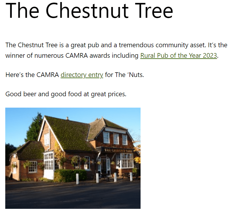Good food and beer at the Chestnut as normal. News that they are selling the pub and moving on is very unwelcome. Nothing stays the same I suppose, enjoy things well you can and hopefully we will be able to find another lovely pub from which we can explore this area.