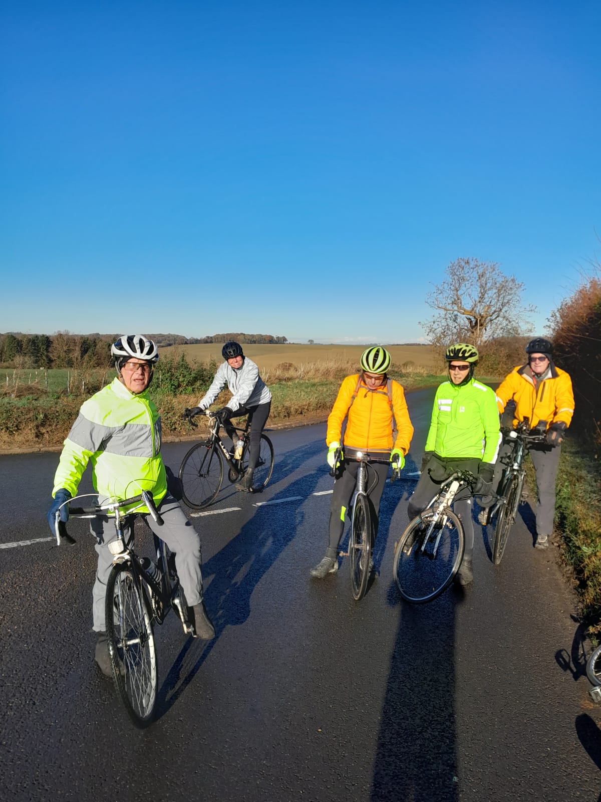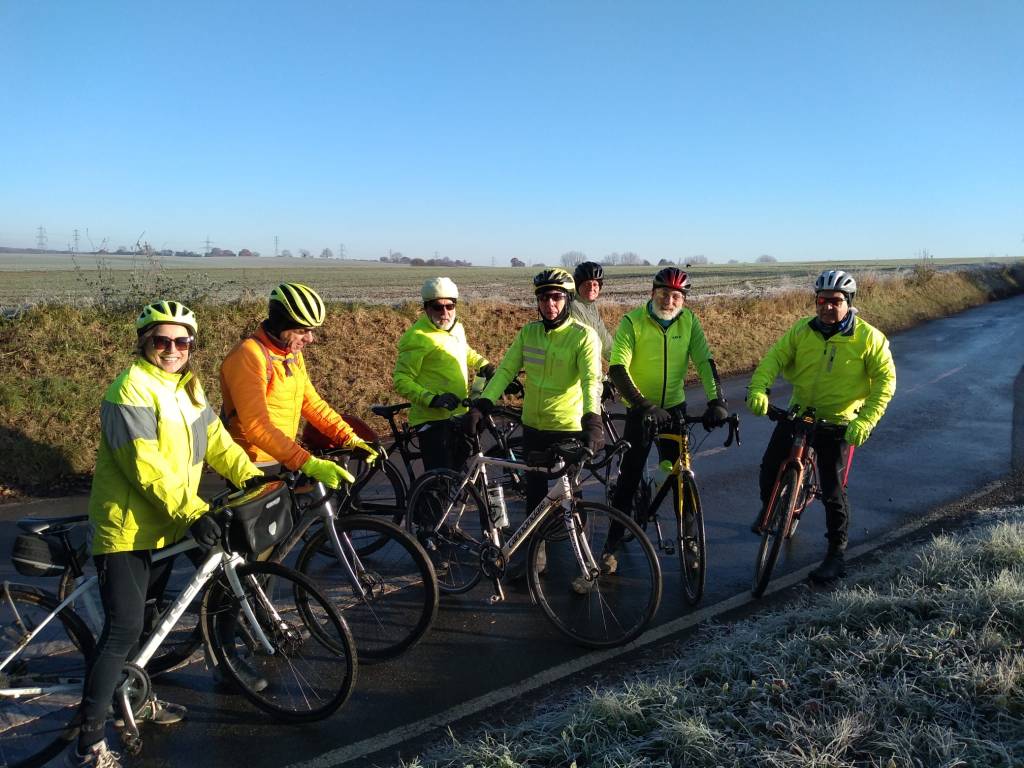 An overnight freezing fog forecast had proved correct and a number of Windmillers decided that discretion was the better part of valour and decided to sit the day out at home with a mug of warm cocoa. Nevertheless eight hardy souls made it to the start, all with tales of icy roads and poor visibility. Over a coffee, a consensus emerged: Yes we would ride (see Rule 9, below) but a slightly delayed start would allow the fog to lift and Simon’s route would be shortened to 31km to avoid the most minor roads.
