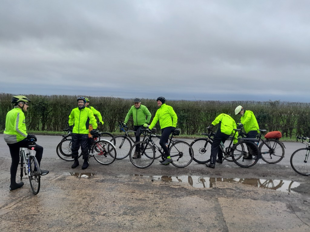 There is a reason why Ireland is lush and green and called the Emerald Isle. It rains a lot. Maybe similar reasoning can be applied to the 9 Windmill riders that turned out despite flooded roads and a forecast of torrential rain later ? Everyone, for the first time I can remember, was garbed in bright green.