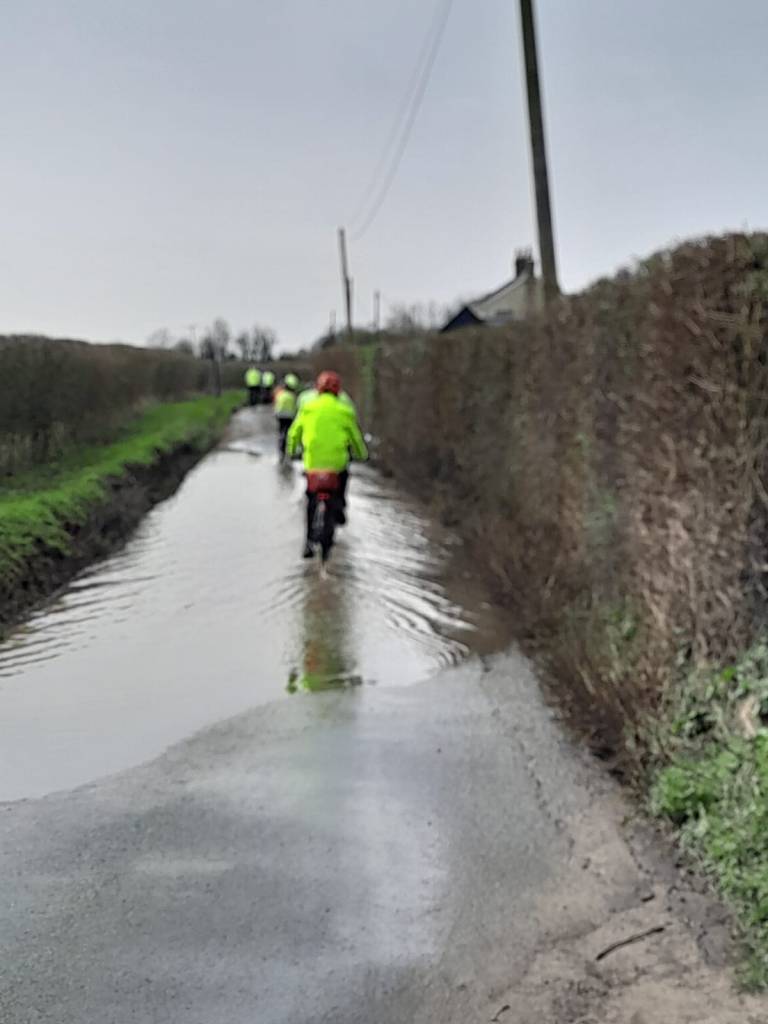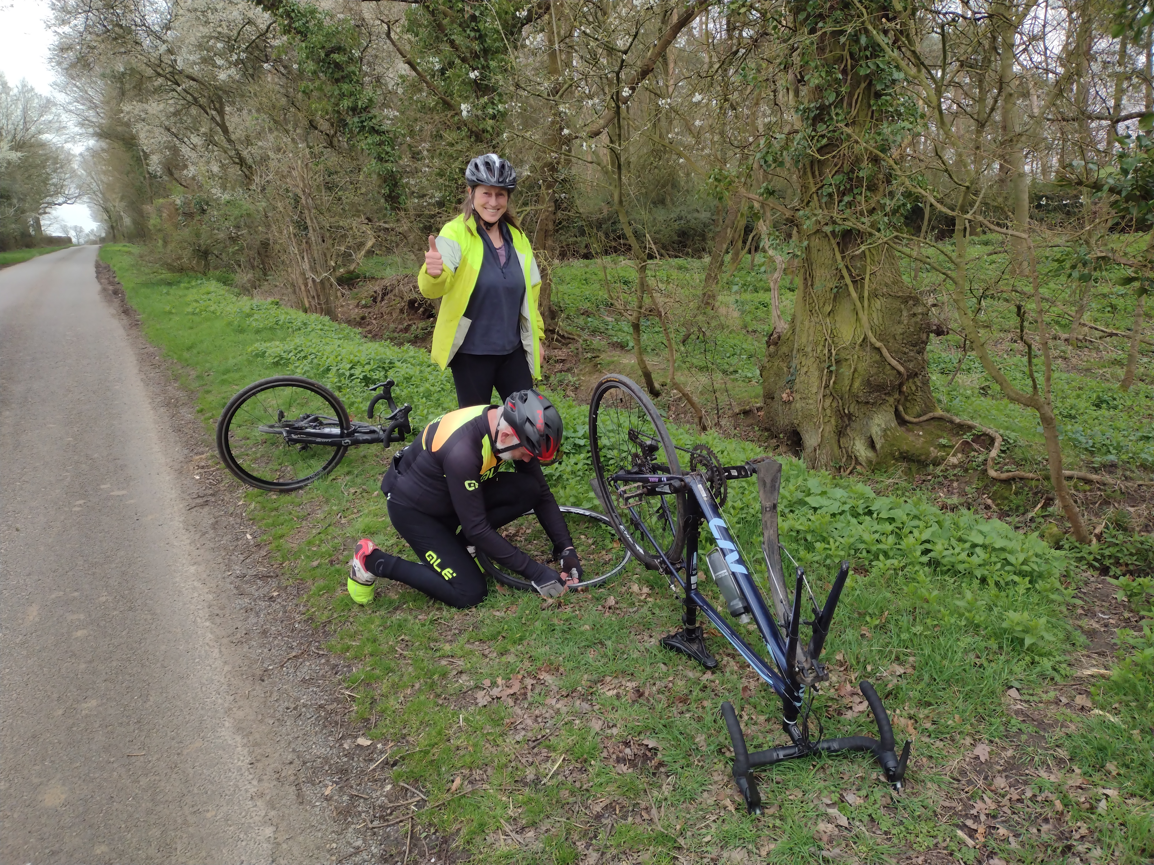 The lost souls caught up but it wasn’t long before a double whammy happened simultaneously to tail enders Deborah and Martin. ‘I’ve got a puncture’, shouted Deborah. ‘And I’ve got an electrical issue’, shouted Martin. The latter was easy to fix, or so it was thought, but without a spare tube or tools poor Deborah started to think about walking the 9 miles still to go. Martin’s spare tube was too big but a call to Gallant Graham, who frequently comes to Deborah’s rescue, soon had him whizzing back with a tube and getting stuck into the job of removing her tyre and replacing the punctured tube.