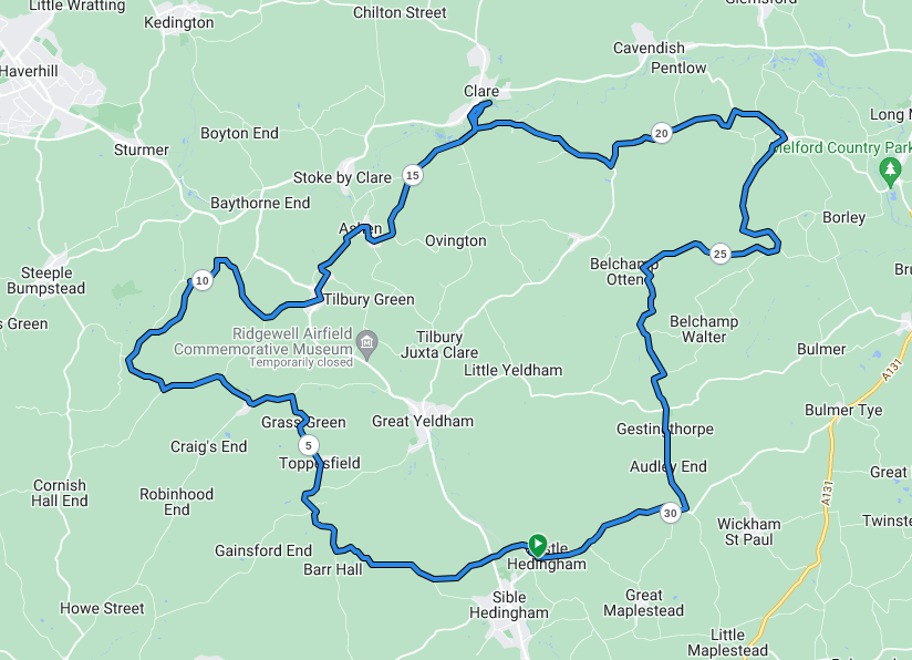 So it was that Simon, Maurice, Roger, Paul and Jeremy followed Brian, still heading clockwise, off towards Clare, some 15 miles distant. The outbound leg was delightful with quiet lanes and fine views across the Colne and Stour valleys.