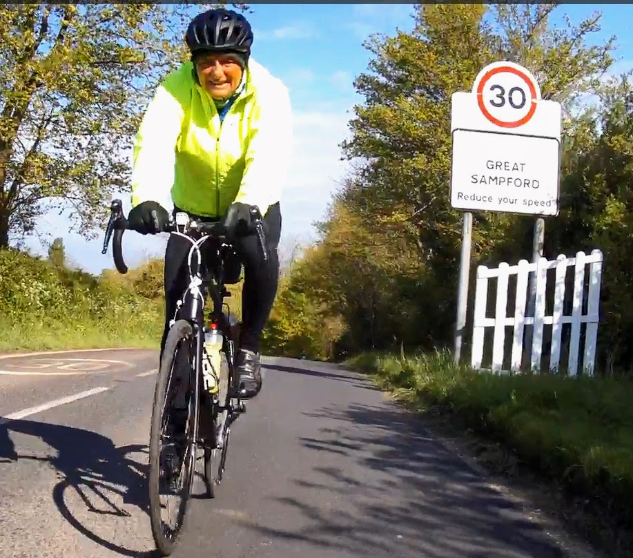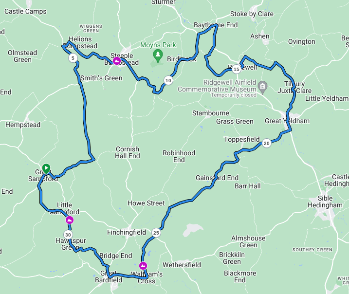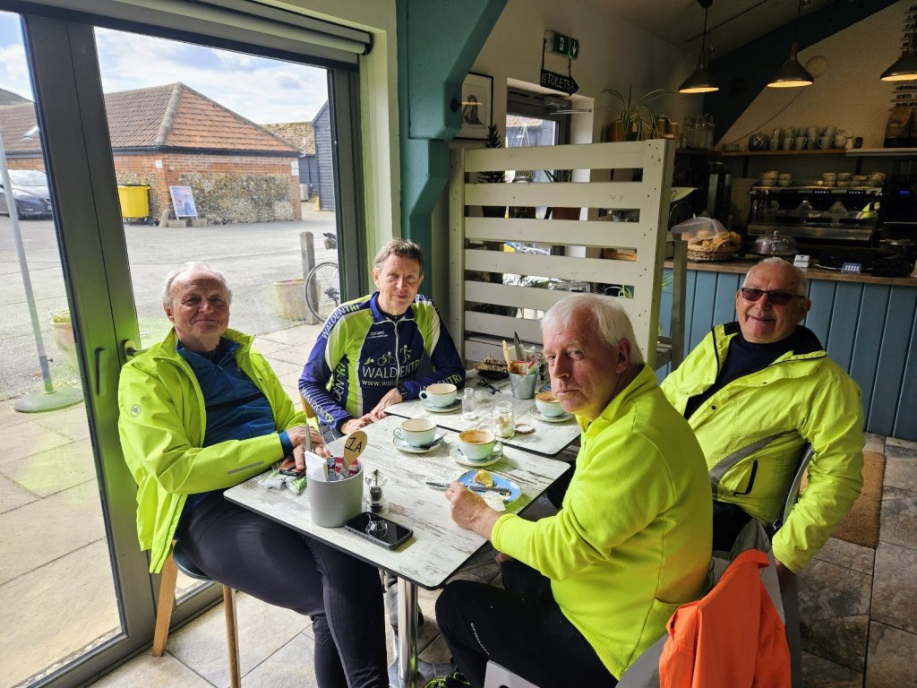 Mid-way, we pulled in at Tarka’s Café, Baythorne End, to fuel up with enough coffee and cake to get us back to Great Sampford. Setting off on the return leg, it wasn’t long before Roger pulled up with a puncture. Unaided, he could have fixed this in 10 minutes but with the help of eager friends it took half an hour. We do so like to be helpful.