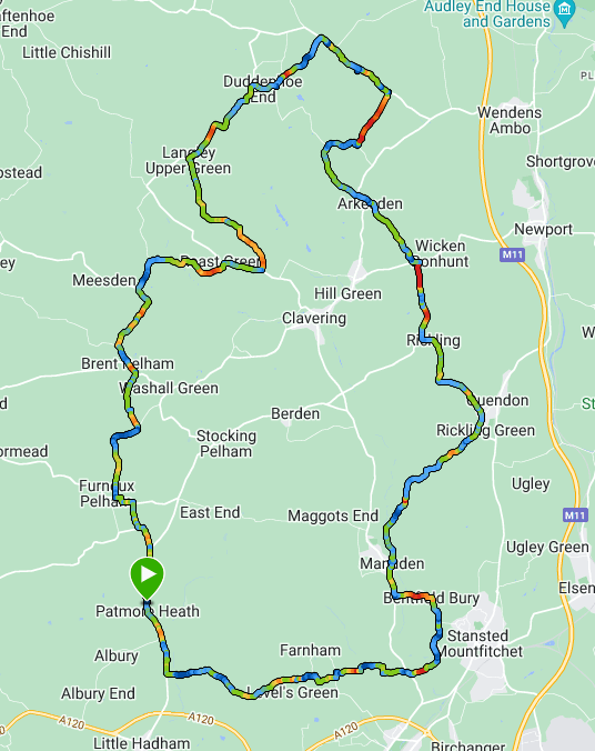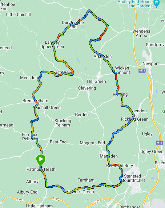 Lovely ride today on another of Maurice’s scenic, traffic-free routes along the border between north Herts and north Essex. Setting off from The Catherine Wheel, Albury, we headed for Hazel End where we turned north for Manuden, Rickling and Arkesden, clocking up some sixteen miles before pulling in for refreshments at Compass Courtyard.
