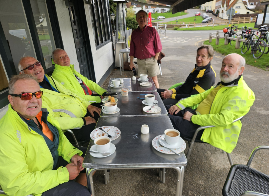 By 11 the world around me had nicely warmed up, as had I. Time for a coffee at at Winners in Finchingfield. Nice place, very efficient and Group 1 (Roger, Maurice, Alan, Charles, Rod and Howard) already had their coffee and were comfortably seated outside.