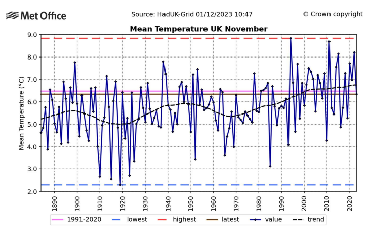 If you look at the temperature for November in the UK you might see what I mean. The black-dashed line in the picture above is the average, the trend, over 130 years.