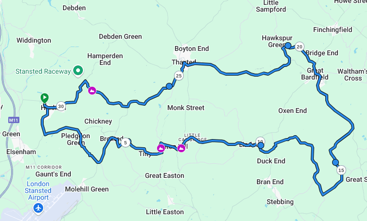 Graham’s route was scenic and free of traffic, with many a quiet lane, one muddy track and a very welcome coffee stop at the Blue Egg. But given the cold, no one was willing to remove a glove (certainly not Brian, who was wearing three pairs) and take a photograph. Alas, dear reader, you will have to make do with Charles’ mugshot above and the map below.