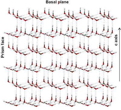 At atmospheric pressure, water freezes to its solid state at a temperature of approximately 0 °C (or lower for salinated water). The heat of fusion of water is 334 kilojoules per kilogram. The specific heat of ice at the freezing point is 2.04 kilojoules per kilogram per degree Celsius and the thermal conductivity at this temperature is 2.24 Watts per metre Kelvin. Most materials contract when cooled but water is different. As water freezes into ice, its molecules arrange themselves into a regular lattice structure through hydrogen bonds. This is more spaced out than in liquid water, expanding its volume by about 9%. This unique property results in ice having a lower density than water, allowing ice to float (and burst water pipes).