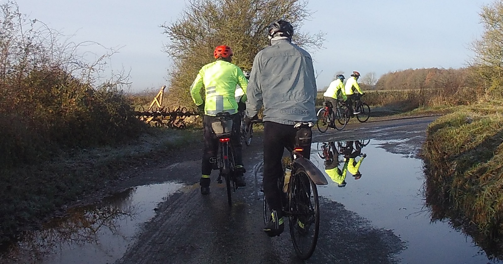 The fourteen Windmillers gathering at the Black Horse, Brent Pelham on Thursday morning did not have the wonders of ice uppermost in their minds, however. For them the salient properties of ice at that time were merely: ‘Cold’ and ‘Very Slippery’ and ‘Not a Good Thing’. Indeed, Roger had already suffered a fall whilst cycling to the start.