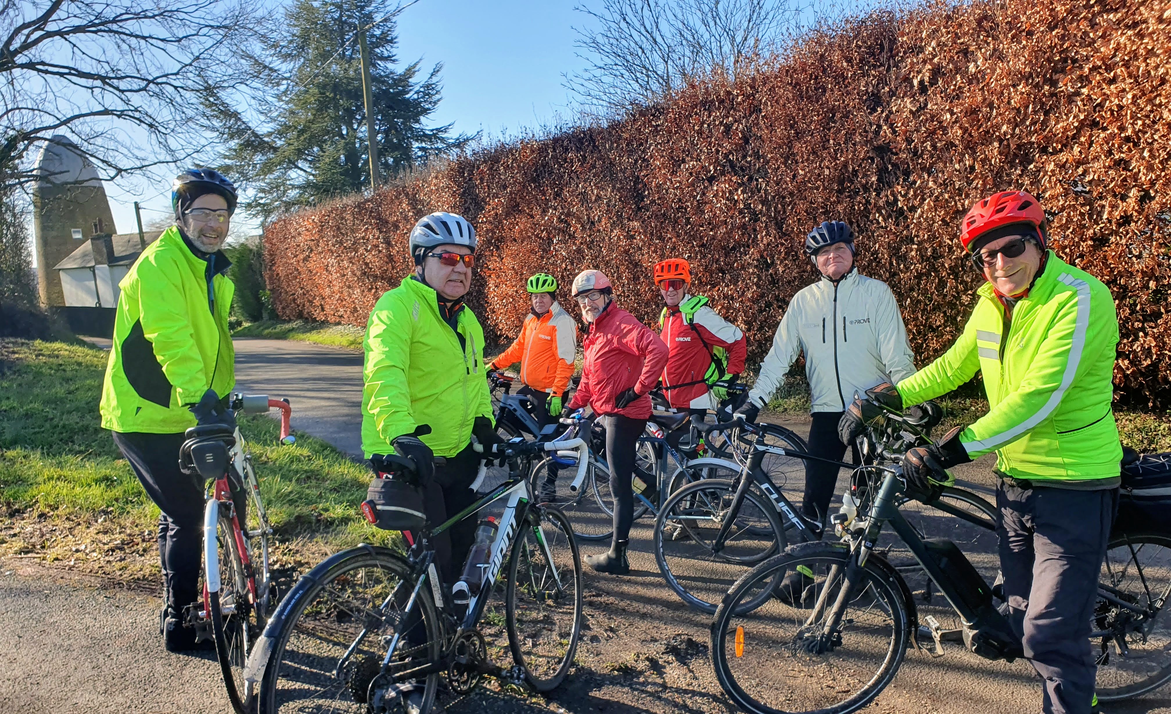 What a sumptious day, all blue skies, sunshine and very light winds, to explore the rural idyll that is North East Herts. Setting off from The Pheasant, we headed south to Anstey and The Hormeads before turning east to Furneux Pelham, Manuden and Rickling Green where we pulled in at The Cricketers for coffee. There’s never a good time or place to suffer a puncture but, if that is your misfortune, where better than just before the coffee stop. So it was that Howard, notwithstanding his sealant-filled tubeless tyres, pulled up with a flat rear tyre. Not to worry; while the rest of us took refreshment, Howard, with the help of yet more sealant (courtesy of Charles) affected a swift repair.