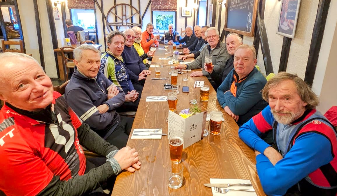 All too often in this ever-online world we find ourselves at the mercy of autofills and spellchecks that render our hastily despatched messages into meaningless gibberish – or even unintended filth; we will never forget Andrew’s promise of a sinning trip to London! This time round it was Martin who, ahead of Thursday’s ride was promising “bidet drinks“. How intriguing; Cillit Bang martinis? Domestos daiquiris? Who knew? On reflection we decided he meant birthday drinks; more specifically, free beer. Top chap! No surprise then that 15 Windmillers turned up for the ride and a couple more freeloaders rolled in for lunch.