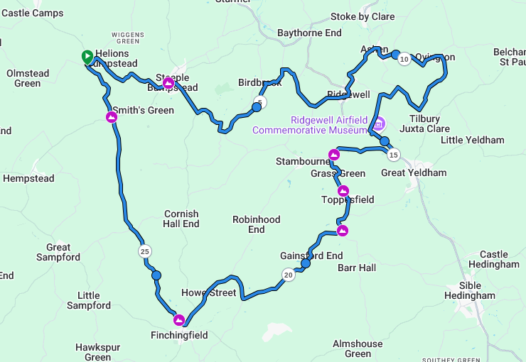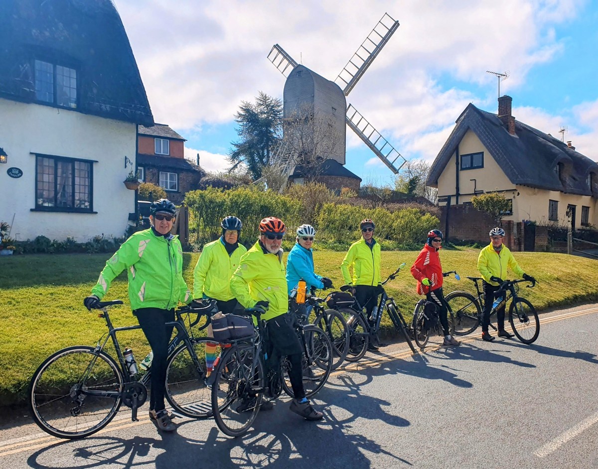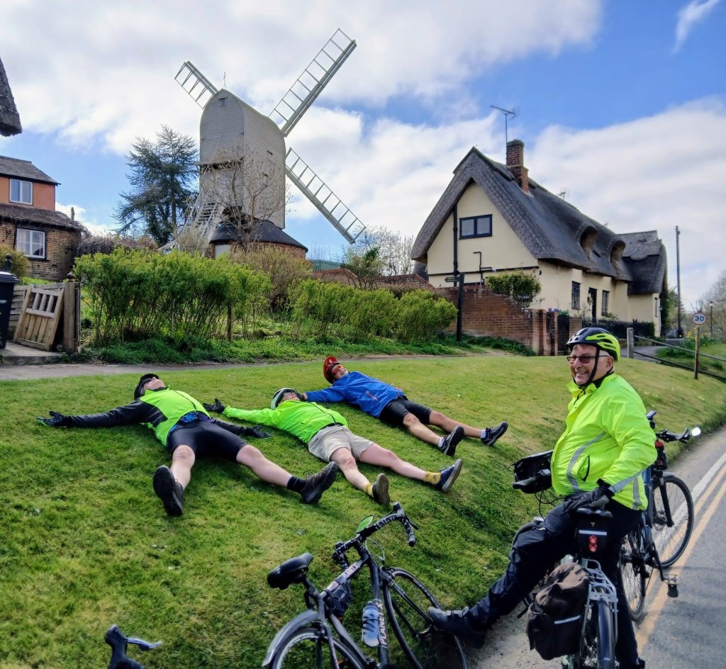 Refreshed and back on the bikes we headed for Finchingfield, pausing for the obligatory windmill photograph, before turning north for the return leg to Helions Bumpstead.