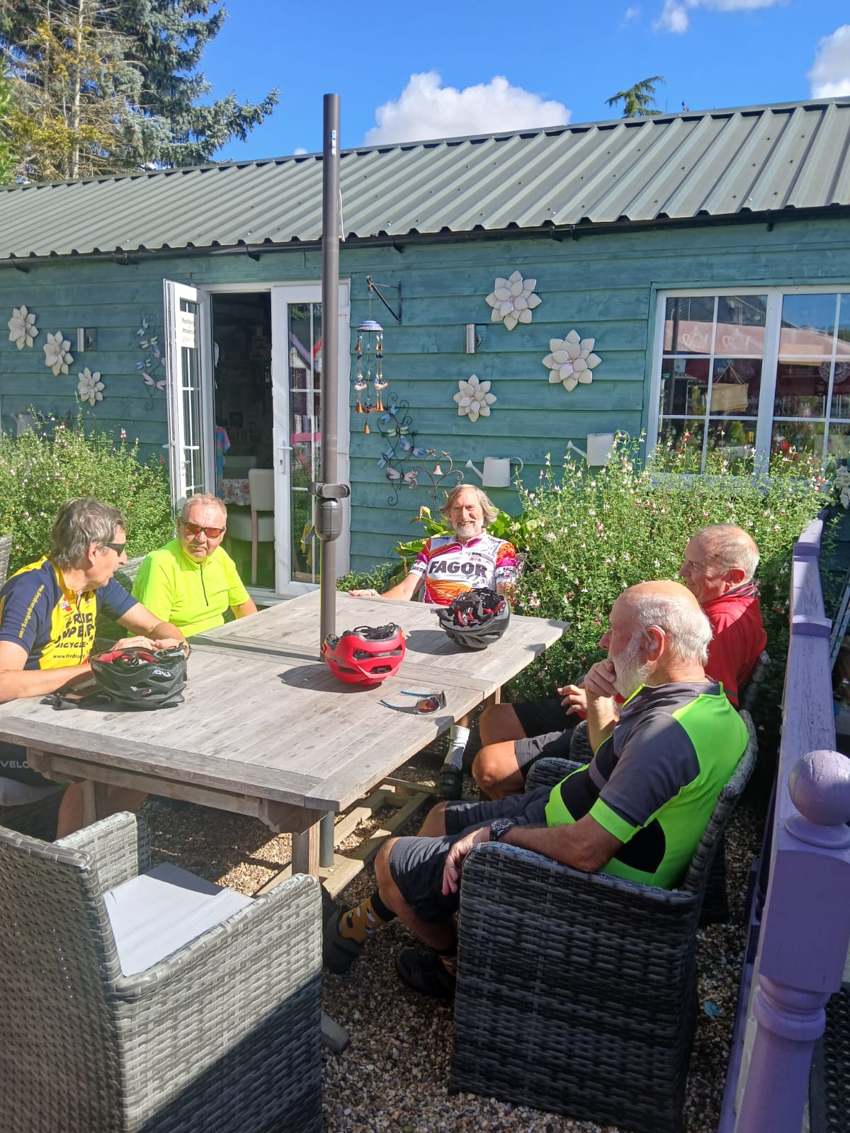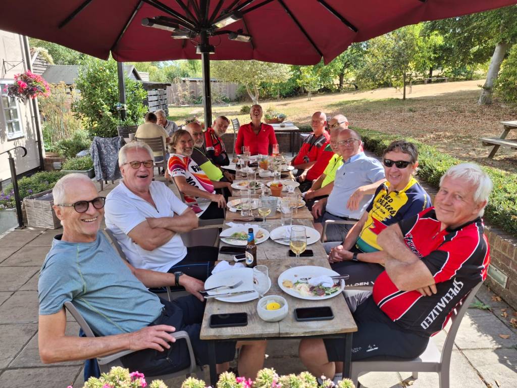 If anything the pace picked up further (or maybe it was just the head wind ?) and by the time we arrived back at the pub, we were all together as one group and thirsty. The forecast rain didn’t materialise (at least not until much later when all riders were safely home), so luncheon was taken on the patio under the biggest sun shade possible. Sadly no birthdays this week.