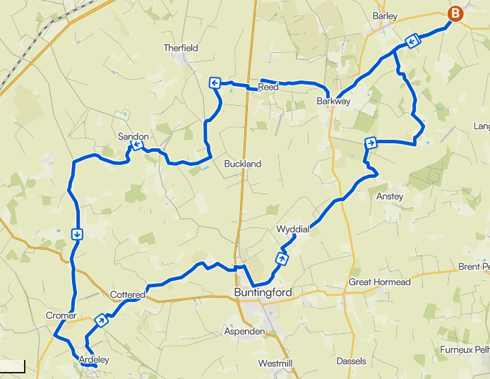 This turned out to be a very nice route. We are lucky to be located where we are, surrounded by beautiful countryside and quiet lanes within easy reach. Crossing the A10 twice proved to be no problem. In fact this route back through the new estate in Buntingford is worth noting.