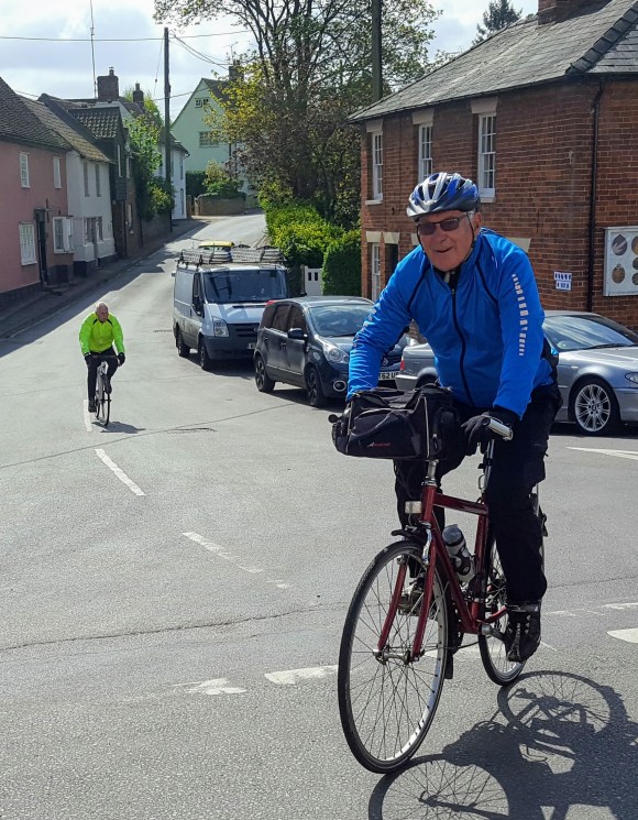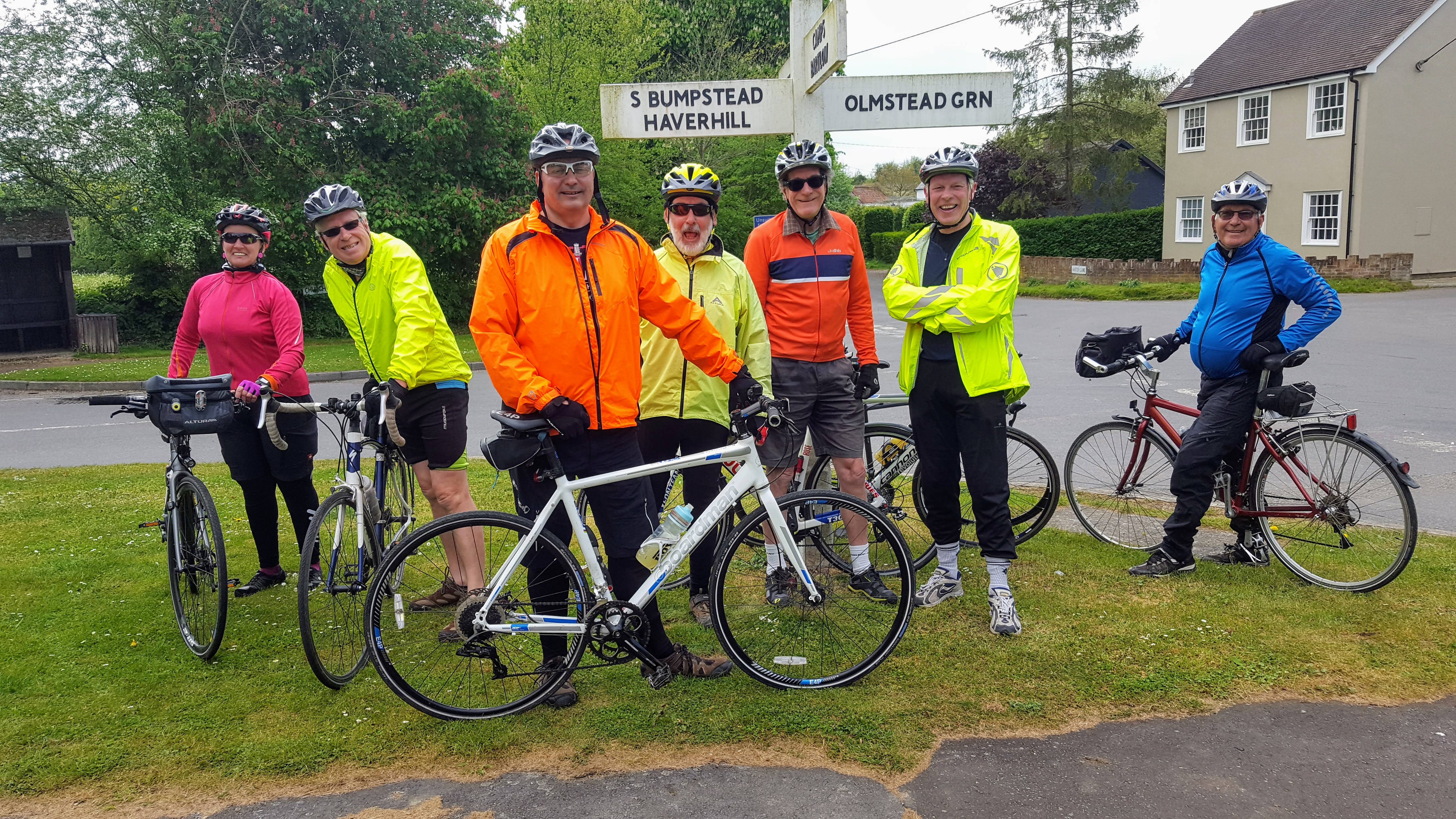 At first we were on familiar territory, wheeling past Rickling and Braughing on our way to Much Hadham, where we pulled into Hopleys Café, a delightful spot with a lovely garden, good coffee, a fabulous selection of homemade cakes and – John was gratified to discover – bottled Adnams. Sandra and Brummie Brian, knowing it’s wise to take on fuel at every possible opportunity, ordered generous portions of blueberry cake.