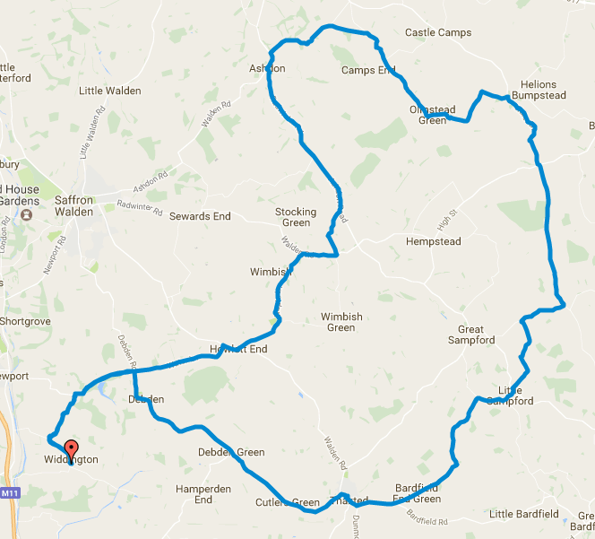 The final leg, through Pledgdon Green and Henham (where we waved goodbye to John as he entered The Cock Inn) and the climb up to Widdington, was hard work on empty stomachs, but we persevered, getting back to the Fleur just as it was closing at 3pm.
