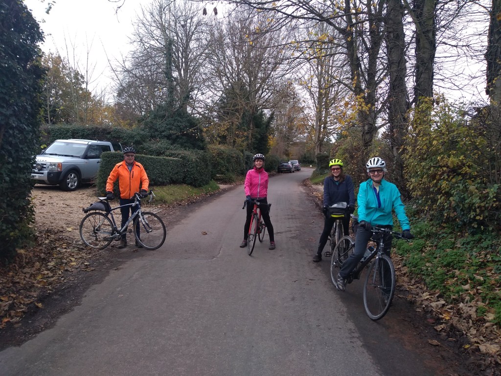 The weekend had been windy. Branches removed from the trees, with lashing of rain and grey skies. So it was with considerable relief that come Monday and the Windmiller’s ride, the weather had turned to give a lovely autumnal late afternoon, with bright sunshine and little wind. The sun shines on the righteous of course. Seven Windmillers assembled at the Red Cow in Chrishall; Martin, Maurice, Alan, Simon, Charles, Deborah and Nicolas. With the present Covid rules we set off well-spaced and in the fervent hope that the locals can’t count.