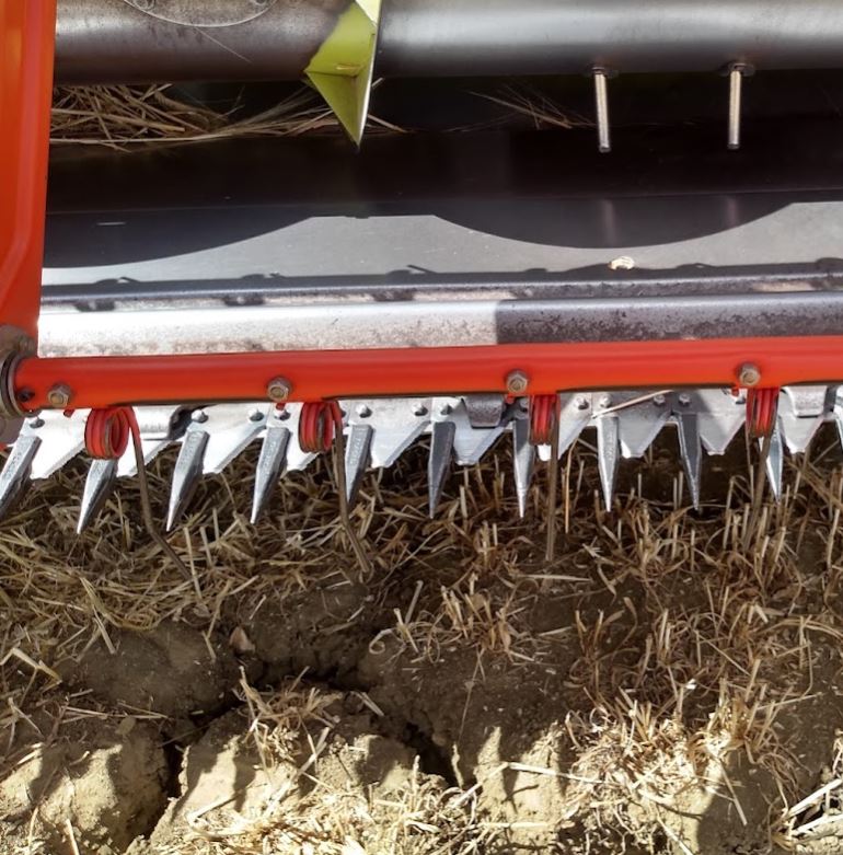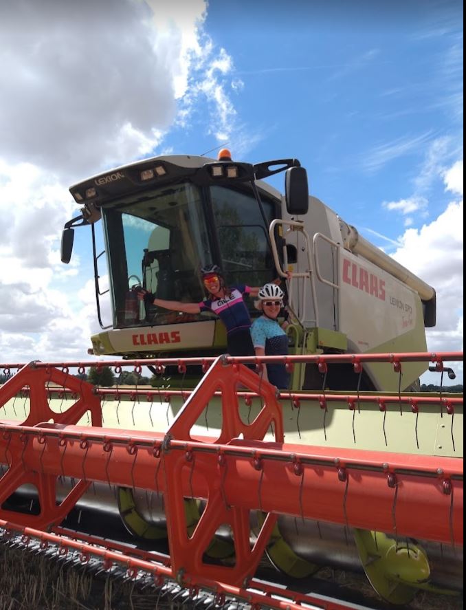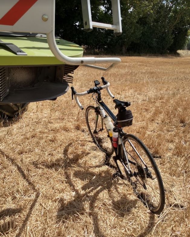 It has been extremely dry, and the harvest has come in early this year. A parked combine harvester allowed us to combine a close-up of the machinery with one of happy members of our group. The clay is so dry and cracked that Alan could park his bike in the fissures opened up by the drought-like conditions. I marvelled at the teeth on this thing, making a mental note never to get run down by one.