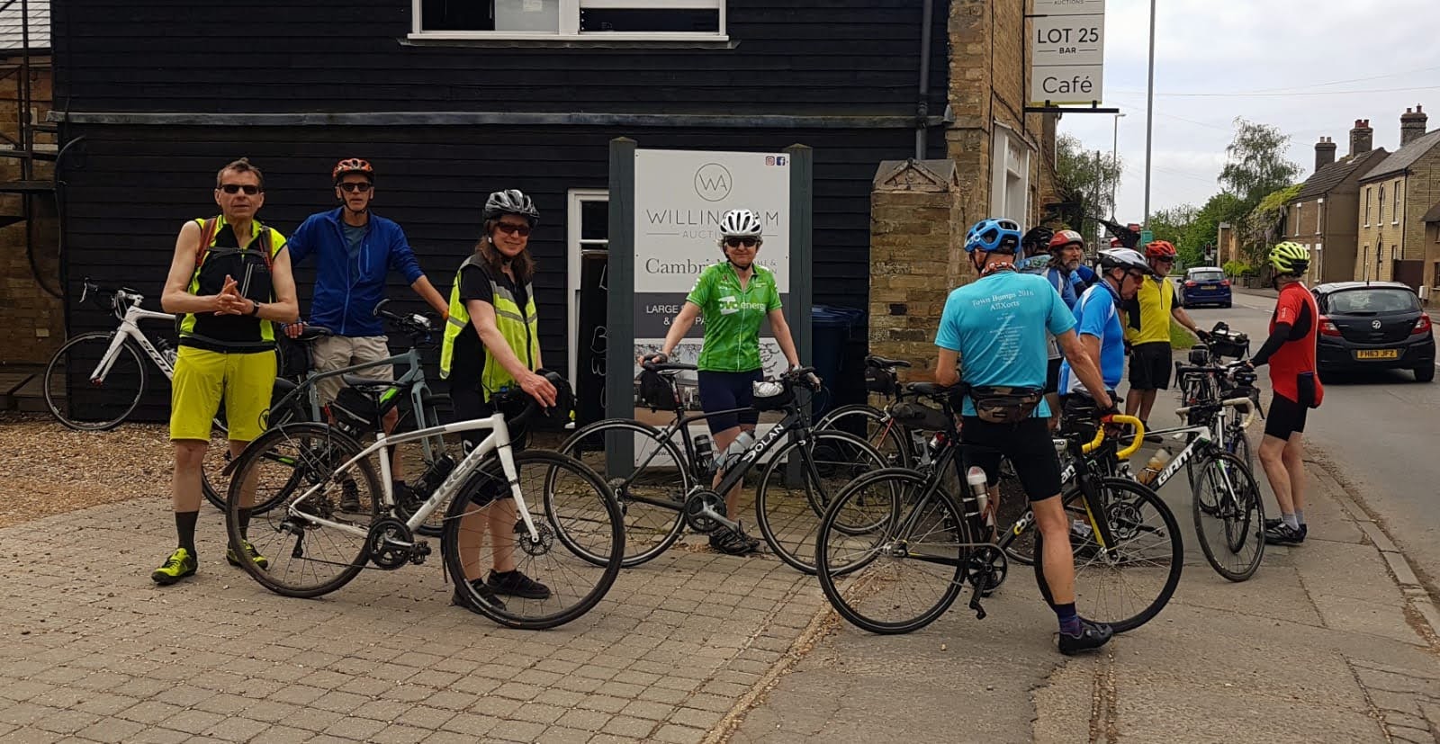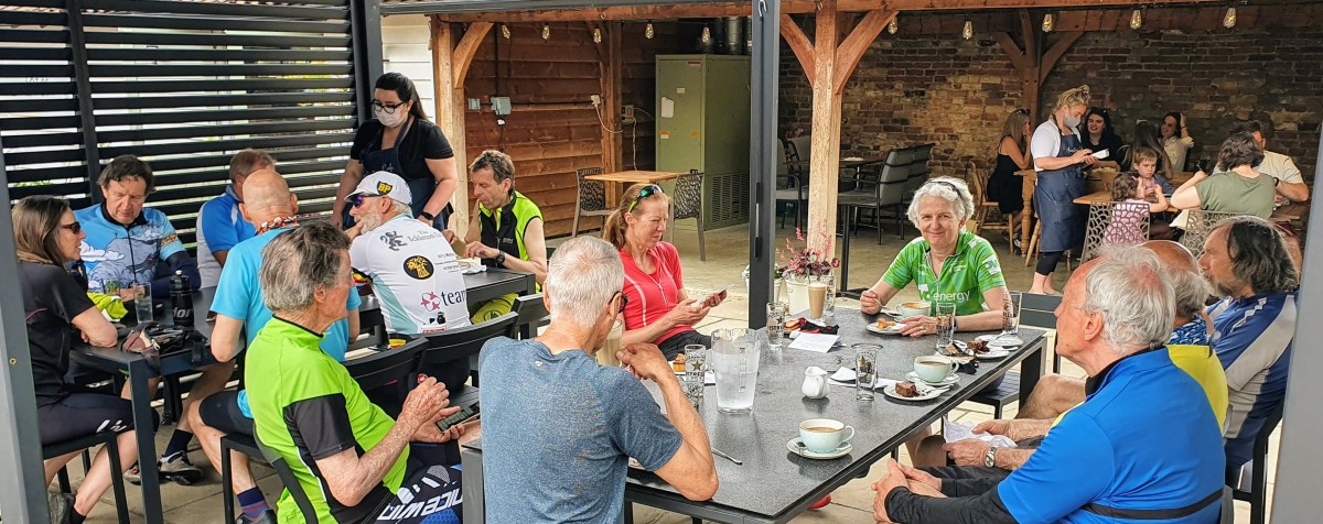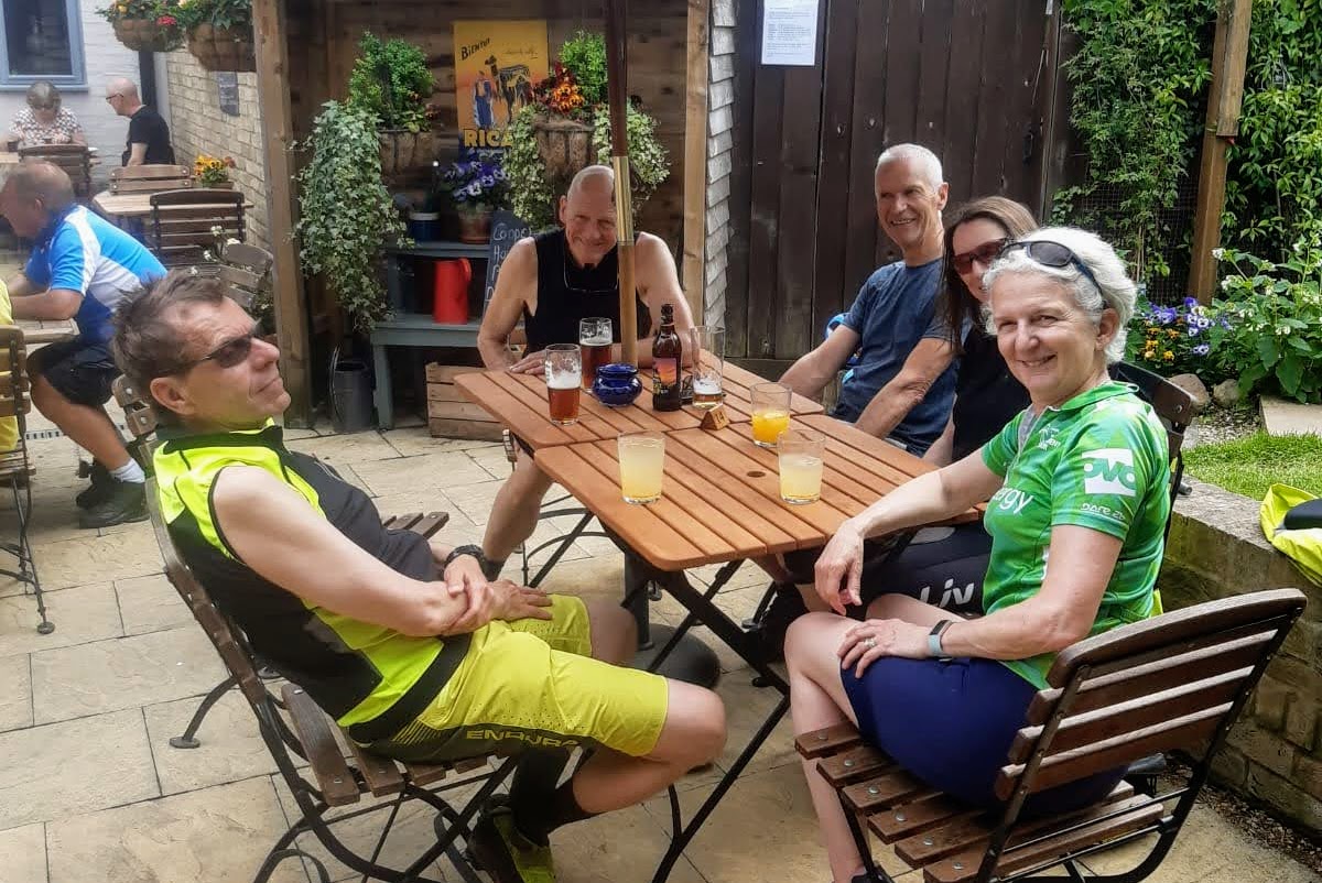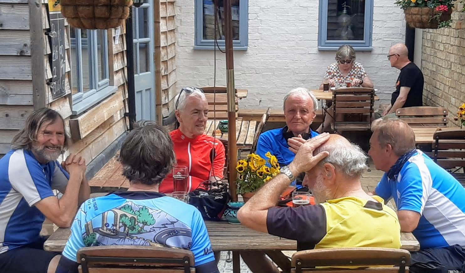 Speaking of toffs, back in Duxford, while us plain folk were quaffing beer, Simon was to be seen sipping champagne. In truth, it may have only been Prosecco but, nevertheless, it was clear evidence of a class divide in the peloton. And we hear Simon’s staff, among them Maurice and Brian, had earlier fixed his puncture. To the manner born, eh?