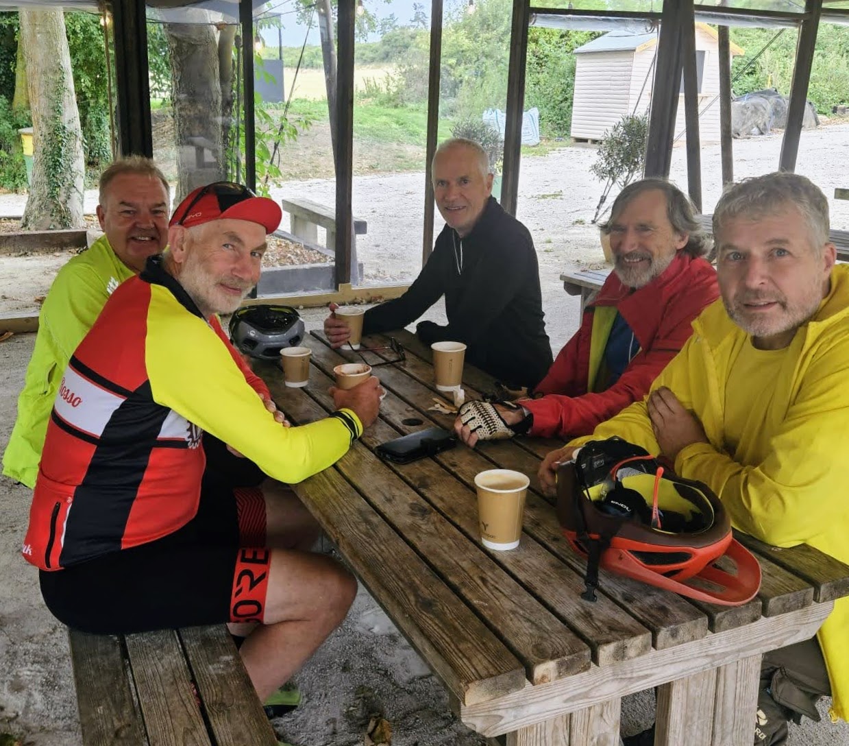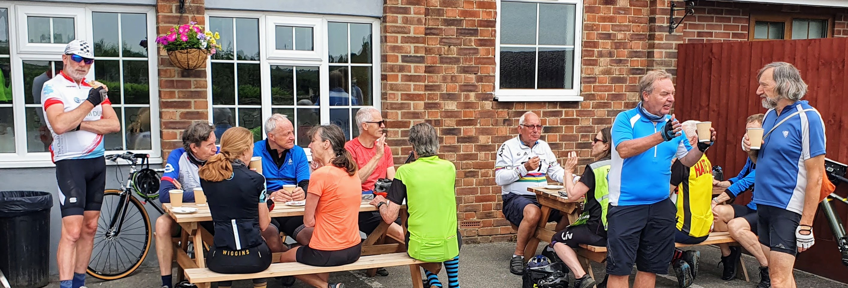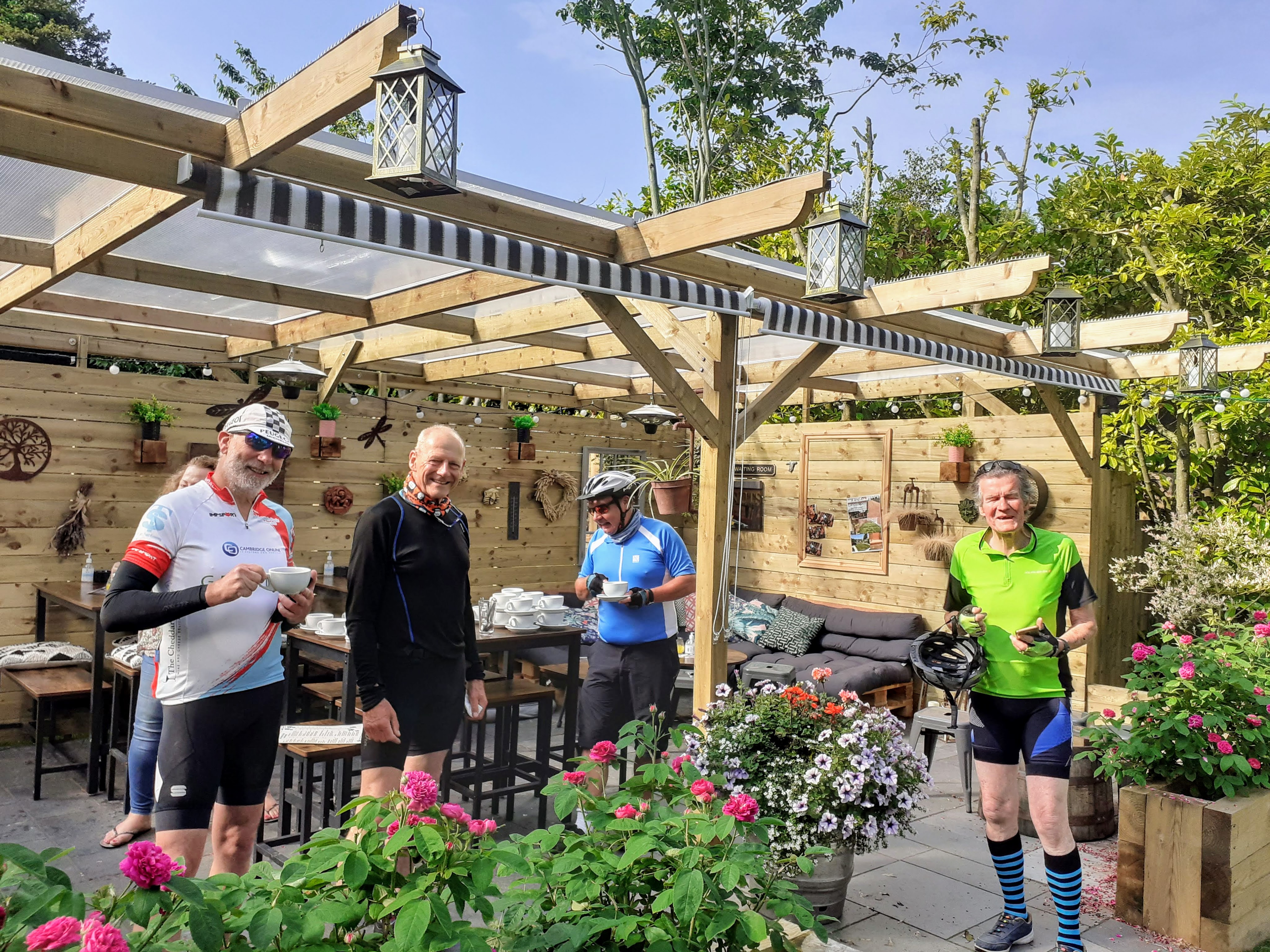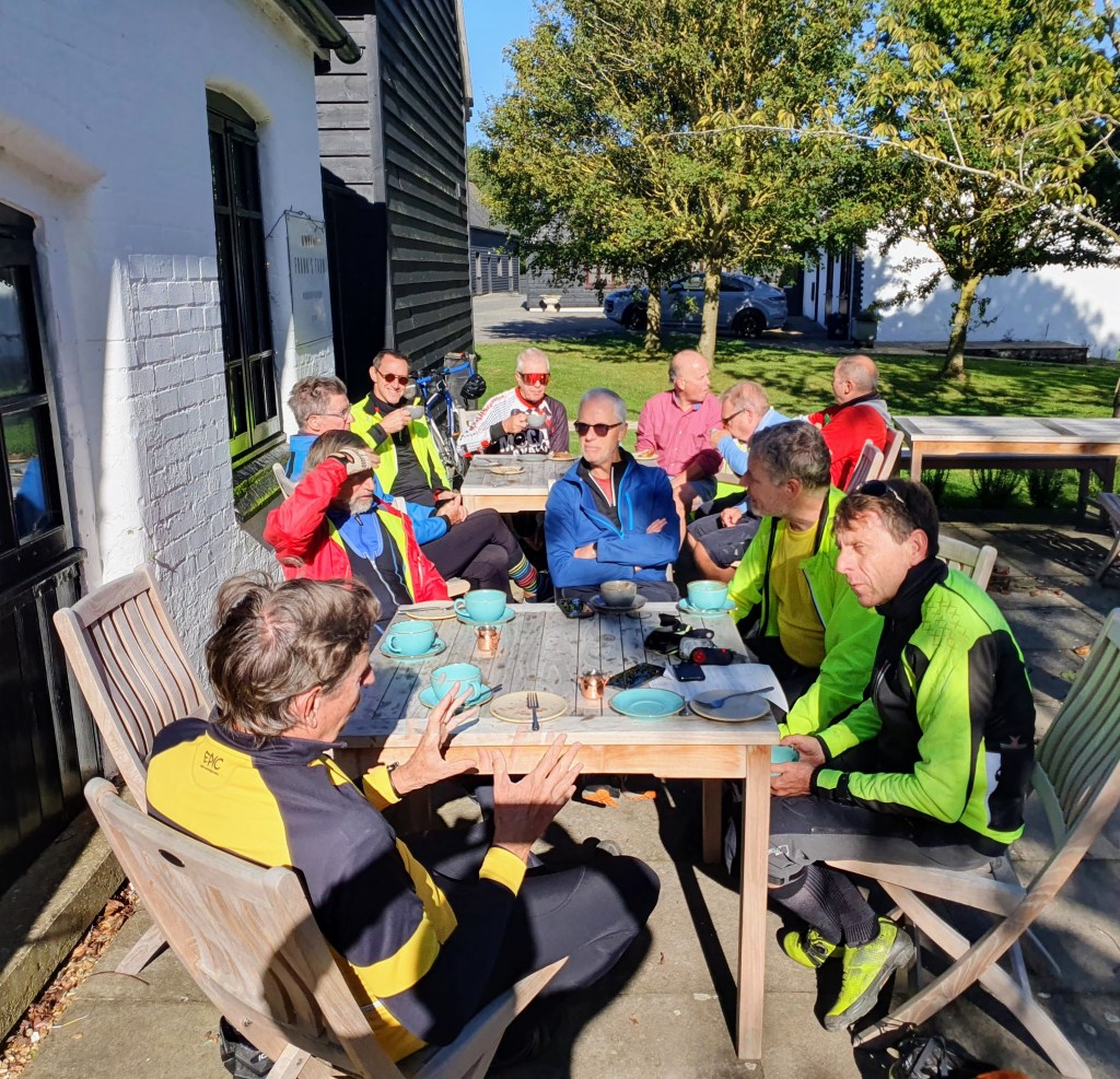 Led by Brian, we had set off in two groups from Harlton on a 30 mile circuit taking in the pretty villages of Knapwell, Elsworth and Boxworth, places we last visited some five years ago, and it was in Elsworth that we pulled in at Frank’s Farm, for us a new venue serving good coffee and home made cakes in a very pleasant garden overlooking a meadow.