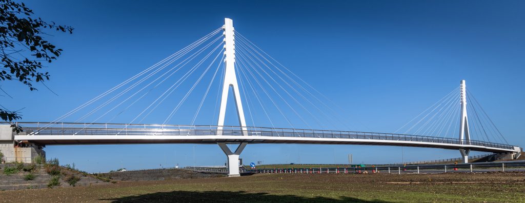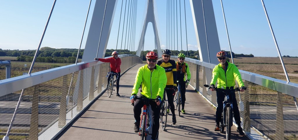 Back on the bikes we notched up another first for the club, crossing not just one but two suspension bridges dedicated to cyclists, walkers and horseriders. (Bridge nerds will know these are really cable-stayed bridges rather than suspension bridges and, if you really want to know the difference, it’s all here.)