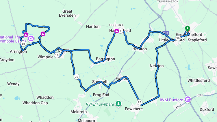 From Haslingfield, we laboured up Chapel Hill before coasting down to Barrington and on via Orwell to Wimpole, where we took the off-road loop through the estate before pulling in at the Old Rectory Café for coffee and cake.