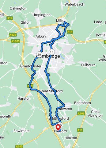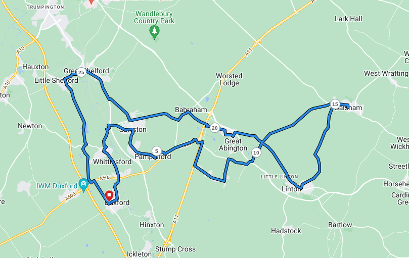 Jeremy’s route; a 33 mile circuit clockwise from Duxford