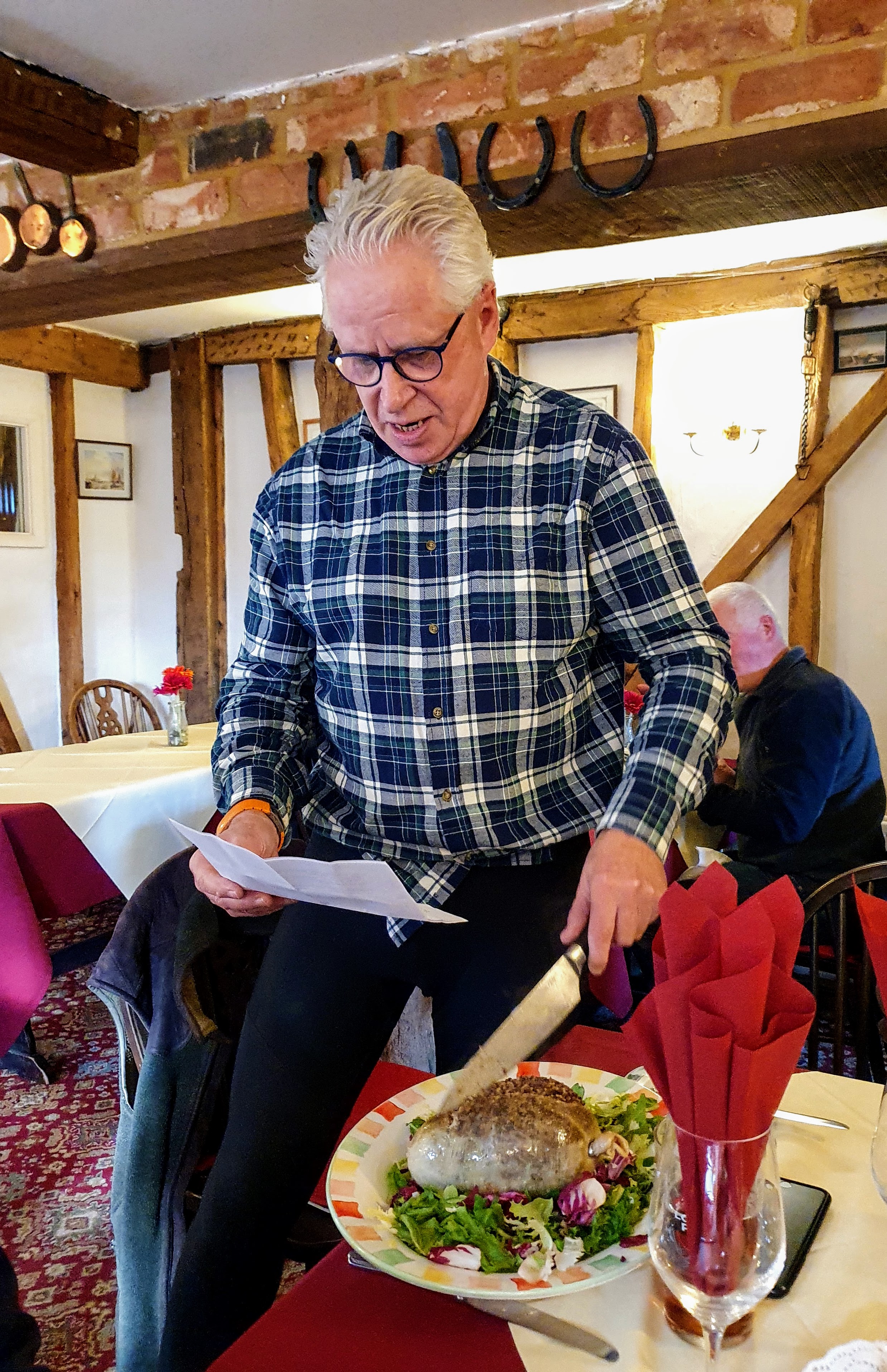 The return leg was thankfully dry and sunny. Back at the Pig & Abbot we enjoyed a restorative pint before, summoned to our table, landlady Pat presented a magnificent haggis, prompting Andrew, our resident Scot, to rise and launch into – not just one – but all eight verses of Rabbie Burns’ Address to a Haggis. Mid-way through, and proclaiming, “An cut you up . . . trenching your gushing entrails bright” he waved a knife alarmingly close to Ken’s nose before slicing the beast open to rapturous applause, while across the pub vegans cowered into their nut roasts.