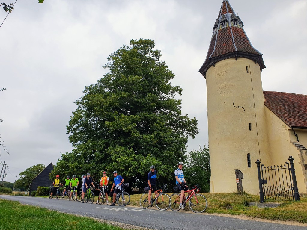 Thursday morning saw a goodly turnout of sixteen Windmillers set off from The Chestnut Tree, West Wratting, for a 30-odd mile tour of West Suffolk. Deceived by the forecast of a dry day, some were regretting leaving their waterproofs at home as they headed out into the persistent drizzle.