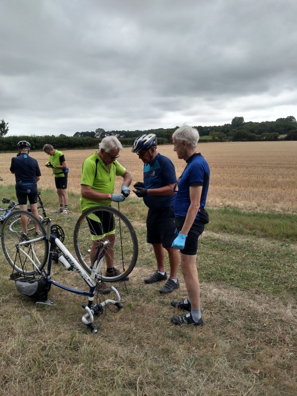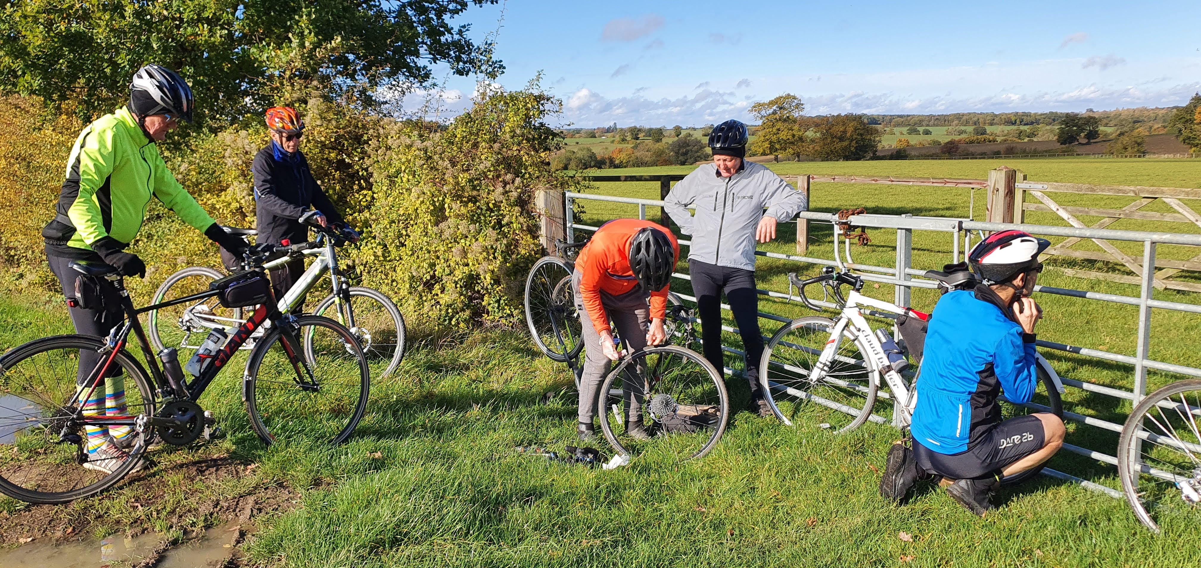 Then came our mid-life crisis where everyone had to rally round with the sole objective of getting back to the pub on-time. On this occasion Deborah had a puncture after we had ridden past some seasonal hedge cutting.