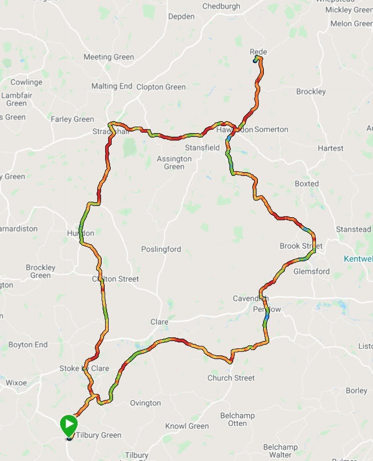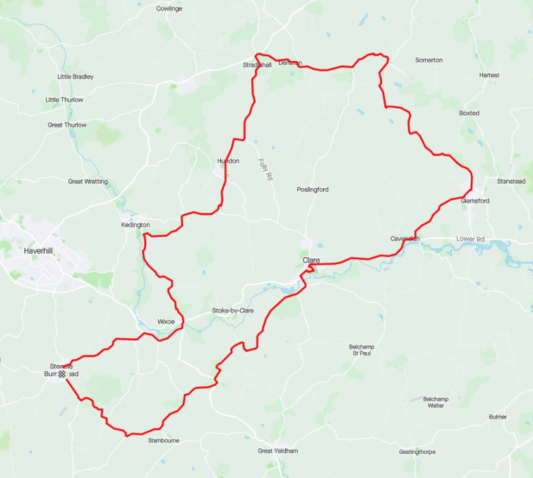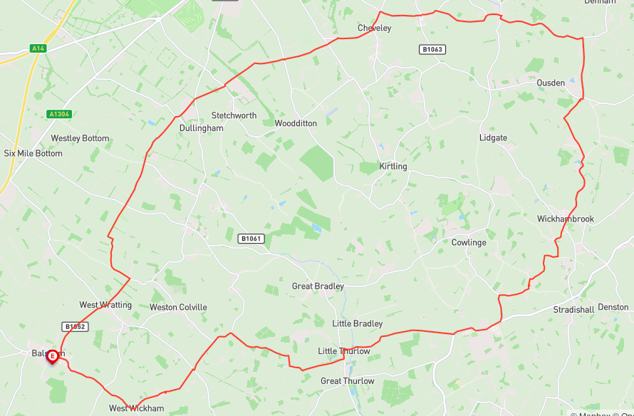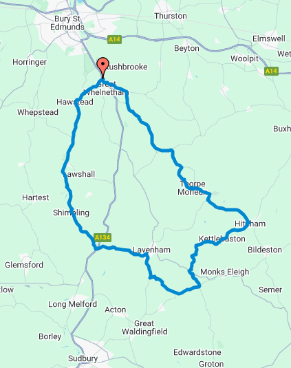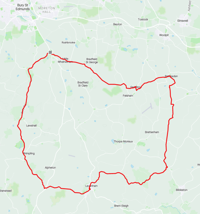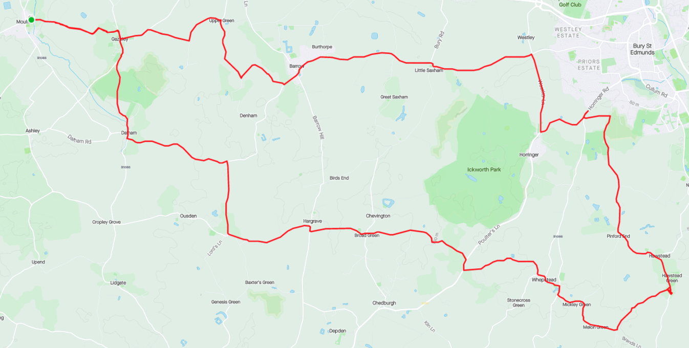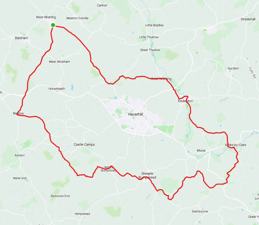 31 miles clockwise: West Wratting – Dullingham – Cheveley – Gazeley – Dalham – Dunstall Green – Lady’s Green – Meeting Green – Attleton Green – Farley Green – Little Thurlow – Carlton Green – Weston Green – West Wratting