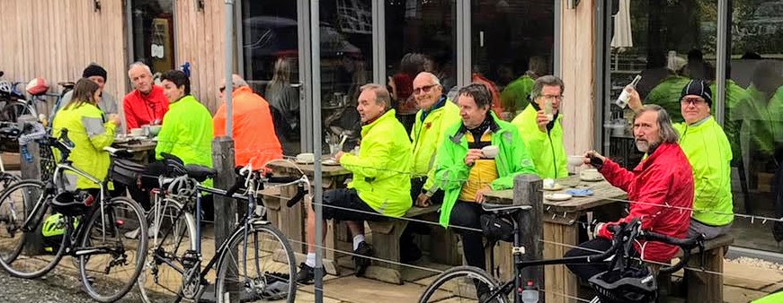 Refreshed and ready to go, twelve Windmillers attempt to form two equal sized pelotons in conformance with government guidelines*. Only it never quite works out, Maurice heading out with eight riders while Brian musters just four. Maybe some can’t count? Maybe – quite understandably – others fear getting lost with Brian? Or maybe it’s just our Keystone Cops-like inability to get organised. Who knows.