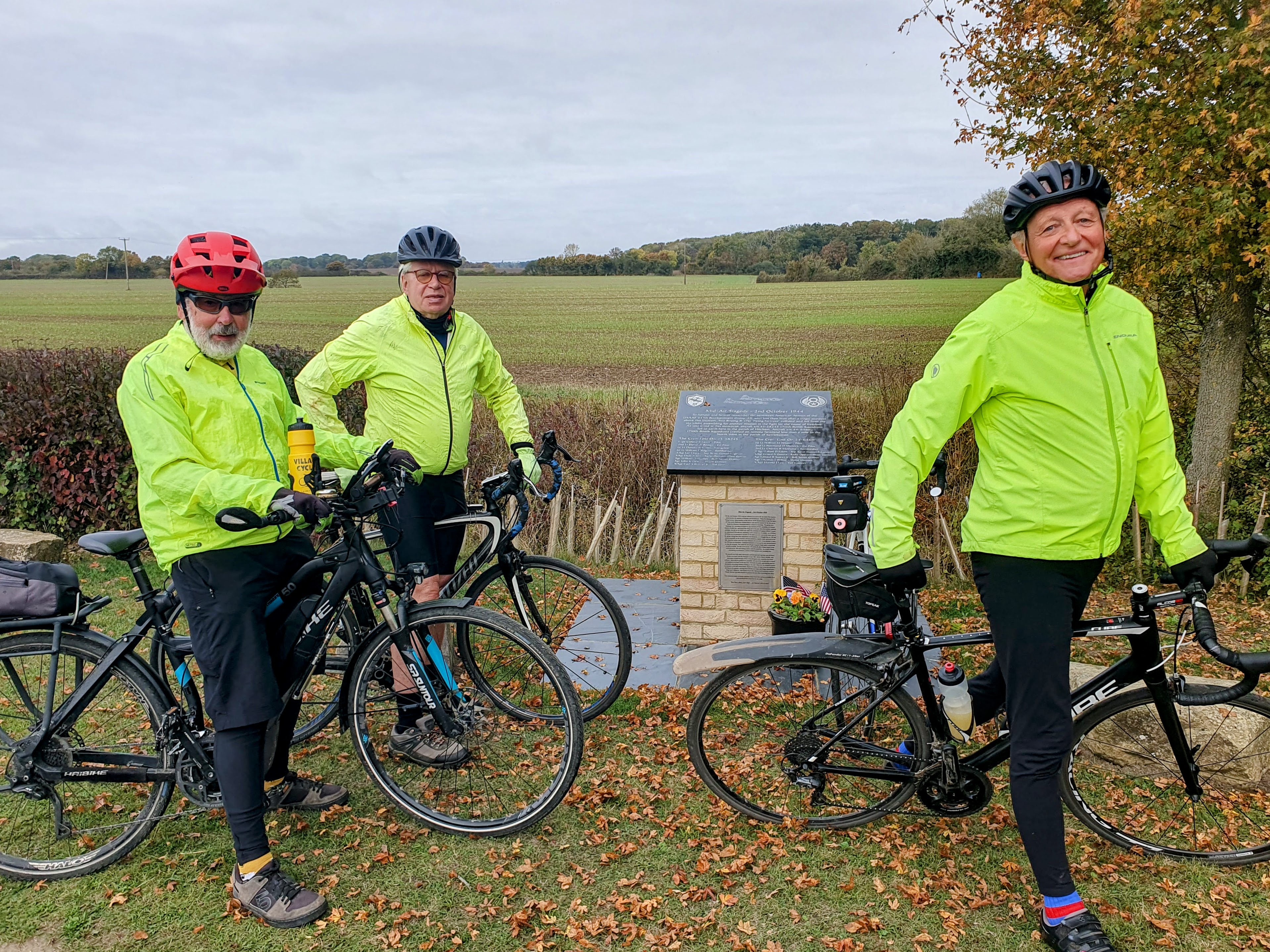 Rod, Andrew and Roger at the memorial on the road between Kettlebaston and Hitcham