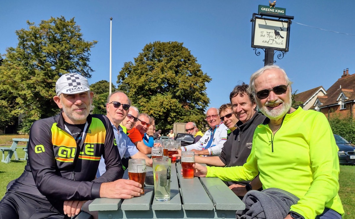 Back on the bikes we took the return leg at quite a lick, spurred on by the prospect of free beer. We were delighted to find Suzanne waiting for us at the pub; having cycled from Abington she was just as thirsty as the rest of us. But thirstiest of all were Graham and Victor who had also cycled from home, then done the 30 mile circuit and had yet to make the return journey. Well done, all