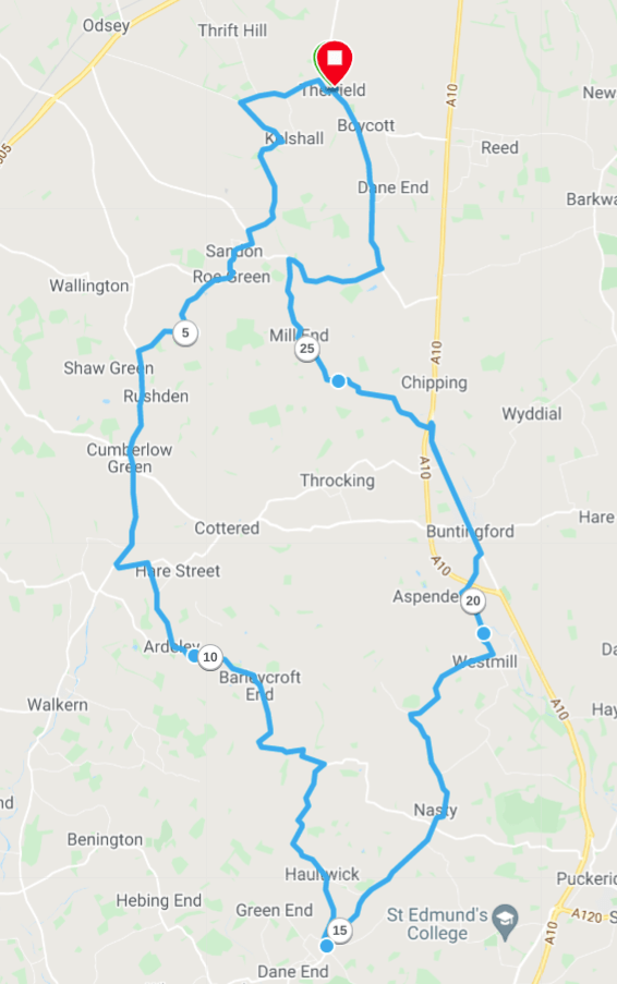 Birthday Girl, Suzanne29 miles anticlockwise: Therfield – Sandon – Rushden – Cromer – Ardeley – Haultwick – Nasty – Westmill – Buntingford – Green End – Therfield