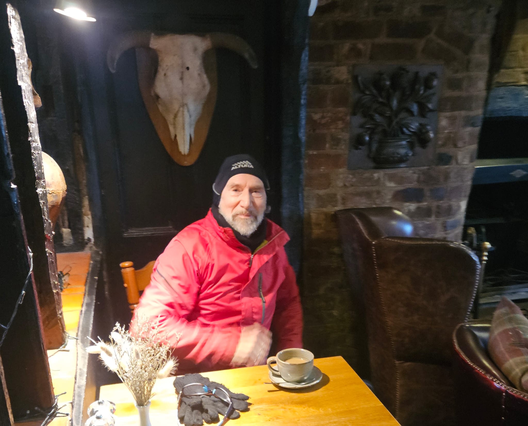 Coffee at Tarka’s. Charles piles on the calories in an attempt to warm up. Just look at those marshmallows in his coffee!