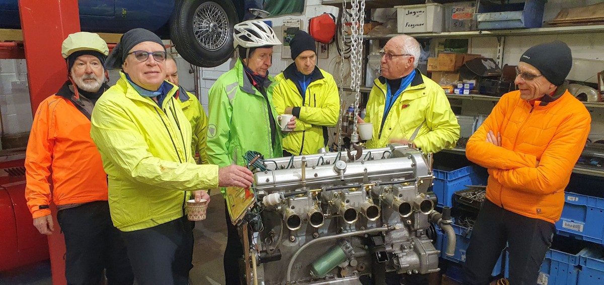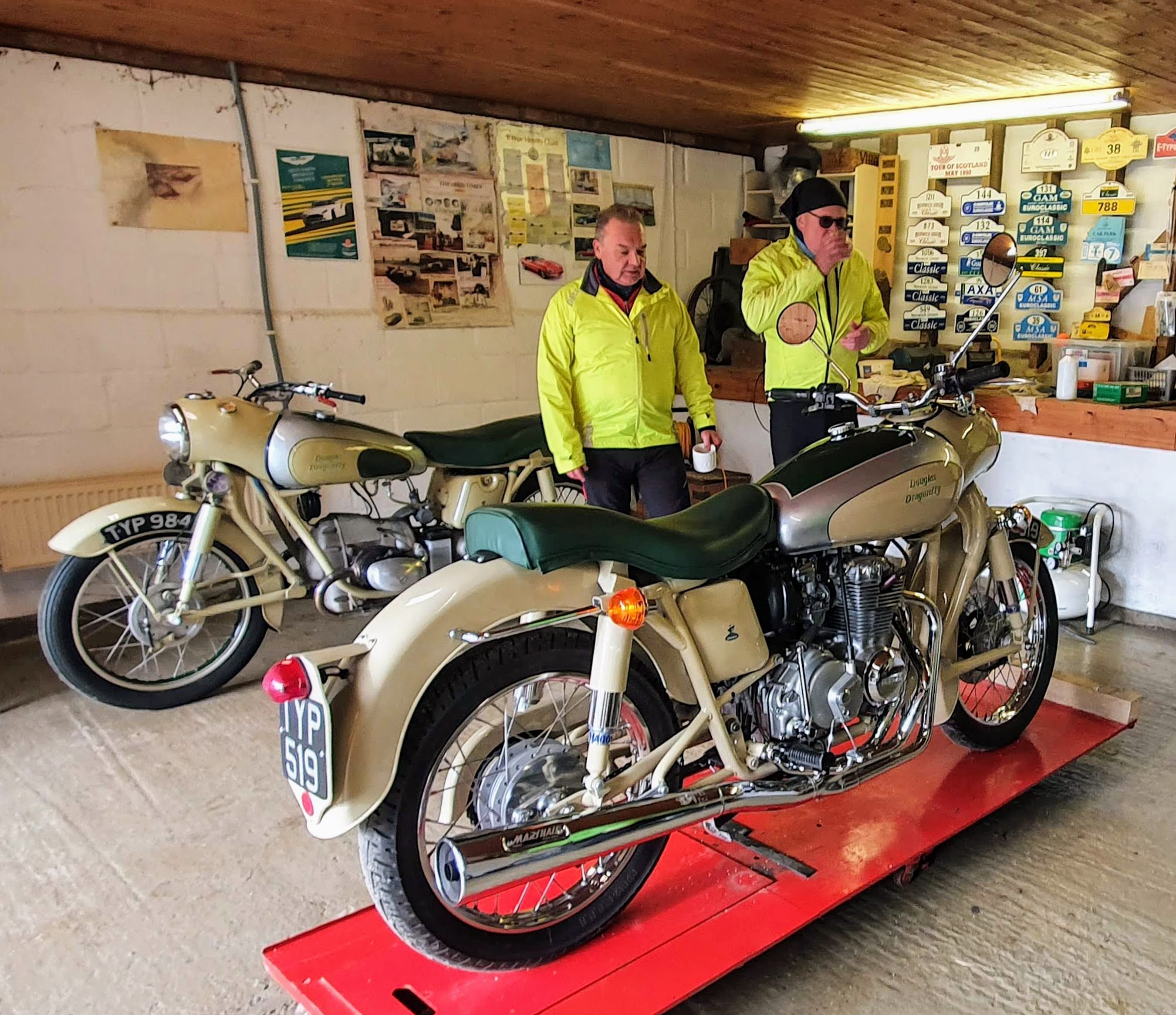The highlight of our ride was the refreshment stop at Heath Farm, where Maurice and Lyn had laid on coffee and hot cross buns. Plus, of course, it’s always interesting touring the barns to view Maurice’s collection of classic cars and engineering projects – the latest of which is a motorbike engine conversion. Owning not one, but two 1957 Douglas Dragonflies, he has replaced one of the original 350cc flat twins with a 400cc, four cylinder Honda engine. The man never sleeps! Indeed, word having got around about this latest job, the editor of Classic Bike Magazine will be visiting tomorrow to interview Maurice and take pictures of the Dragonflies.
