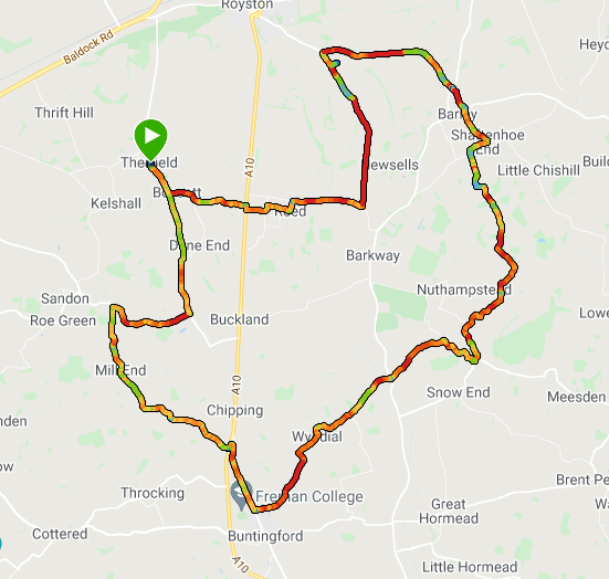 Blood sugar levels restored, we mounted up and headed for Ashwell, from where – taking our lives in our hands – we crossed the busy A505 and headed back to Therfield via Sandon and Kelshall.