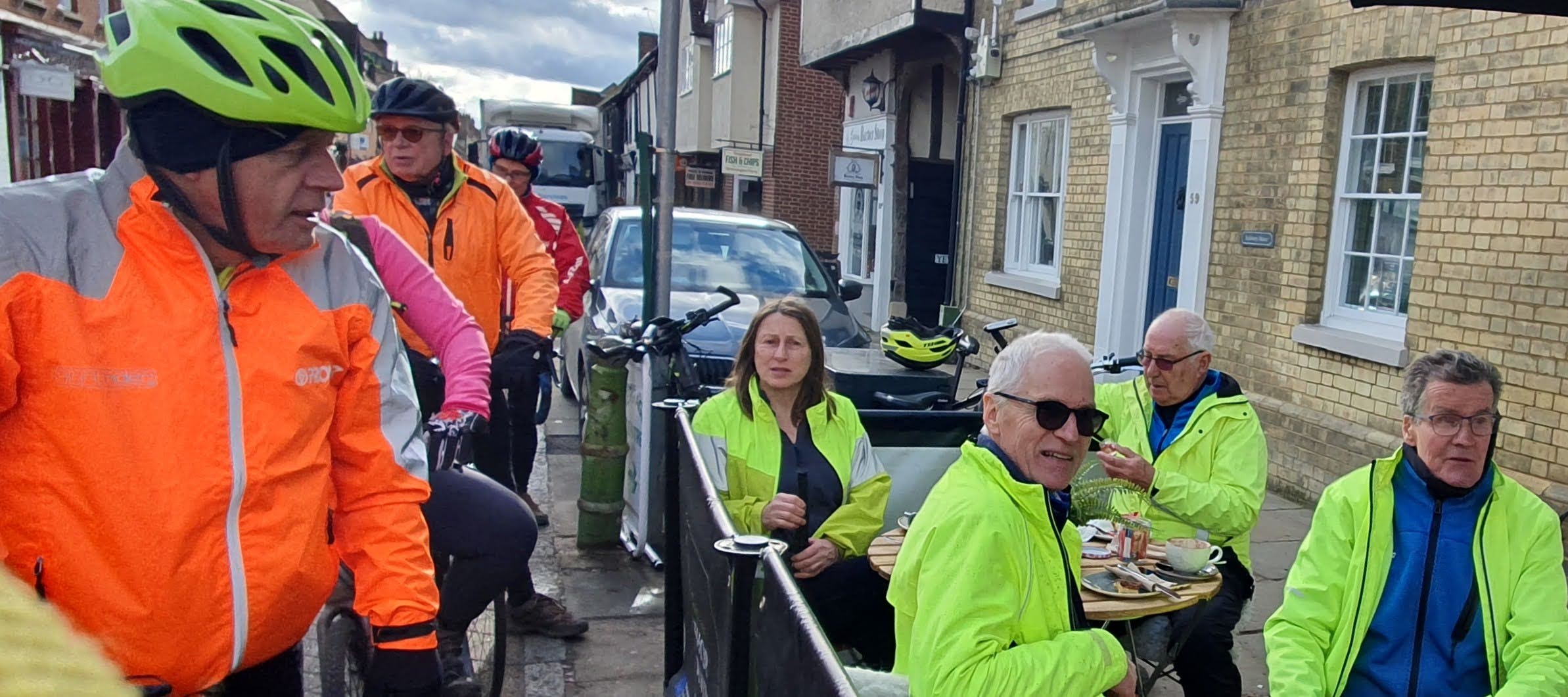 Rod’s route took us south from Therfield, with an early coffee stop just nine miles in at Ardeley – or at least that was the plan. Half of us did indeed stop there – but were bemused to see the other half sail by, seemingly oblivious to the prominent sign, ‘Farm Café & Coffee Shop’. You can only lead a horse to water,eh?