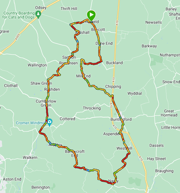 Thanking Lyn for the hospitality, we resumed our ride, heading for Nuthampstead – where we tipped our hats to John Tarrington – and thence Buntingford, before turning northwards for the return leg to Therfield.