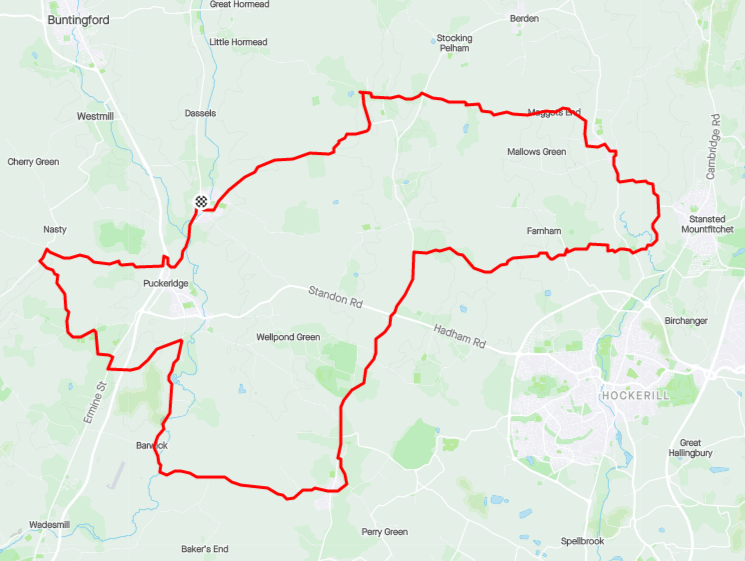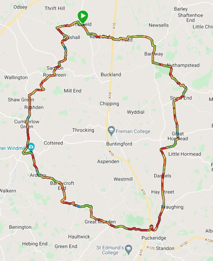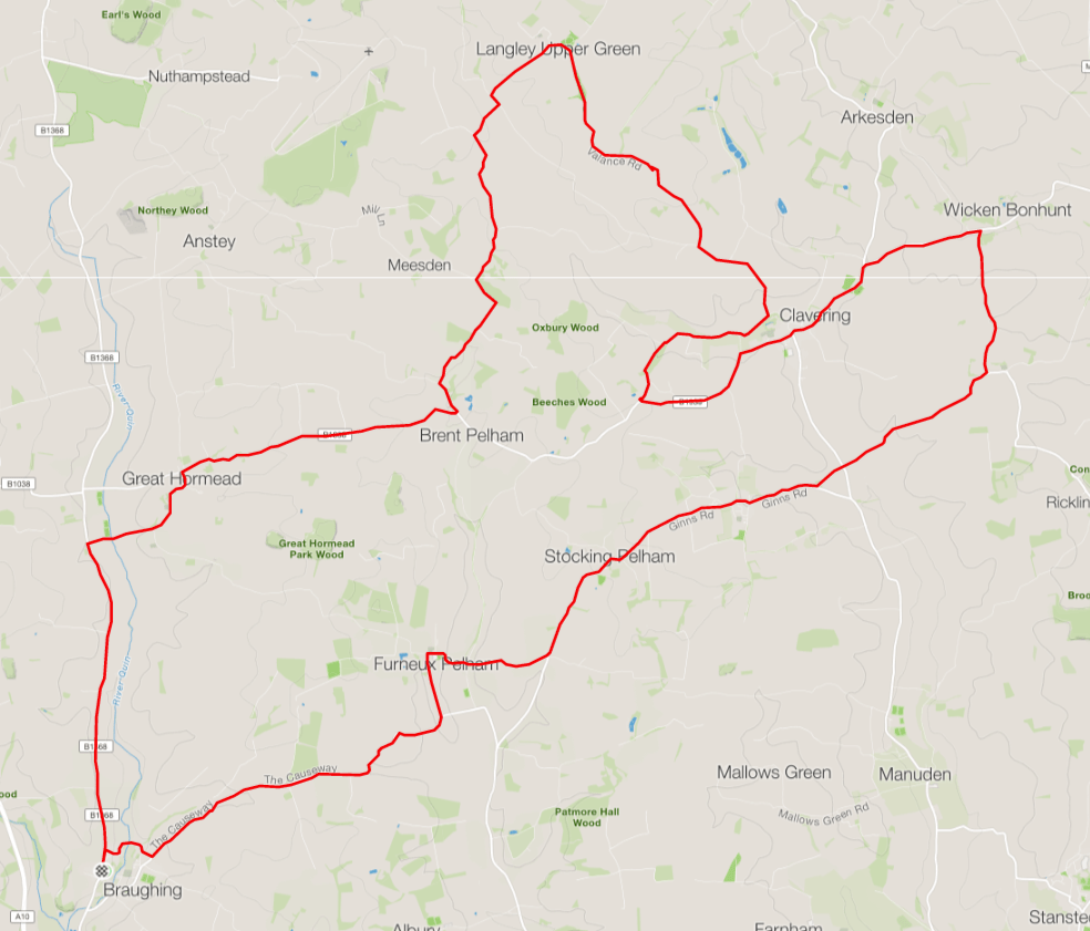 A 30 mile figure of eight: Braughing – Puckeridge – St Edmund’s College – Nasty – Great Munden – Haultwick – Whempstead – Benington – Walkern – Ardeley – Wood End – Great Munden – Nasty – Braughing