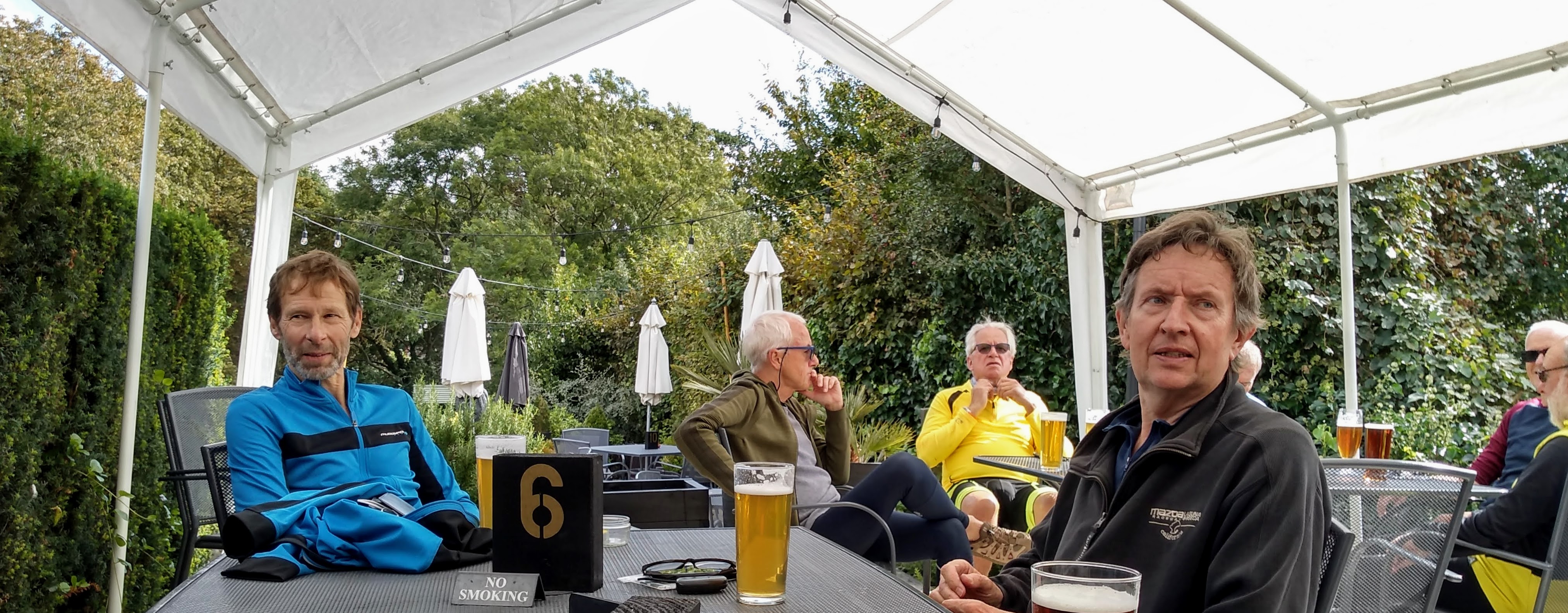 Back on the bikes we puffed our way around the remaining 18 miles, pausing occasionally for the pedallers to catch up with the electrically assisted. Cresting the final hill between Puckeridge and Braughing, we returned to the Golden Fleece looking forward to a beer.