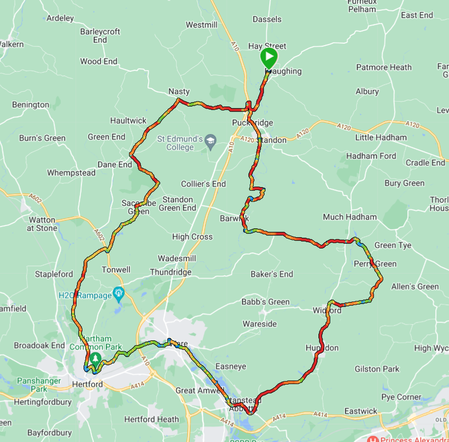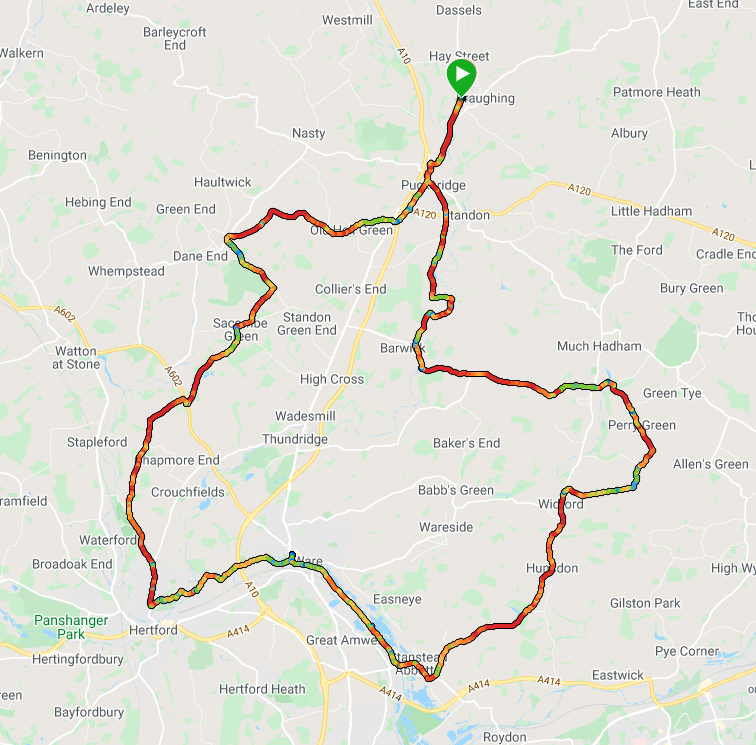 Cheers!A 30 mile figure of eight: Braughing – Nasty – Great Munden – Wood End – Ardeley – Walkern – Benington – Whempstead – Haultwick – Nasty – St Edmund’s College – Puckeridge – Braughing