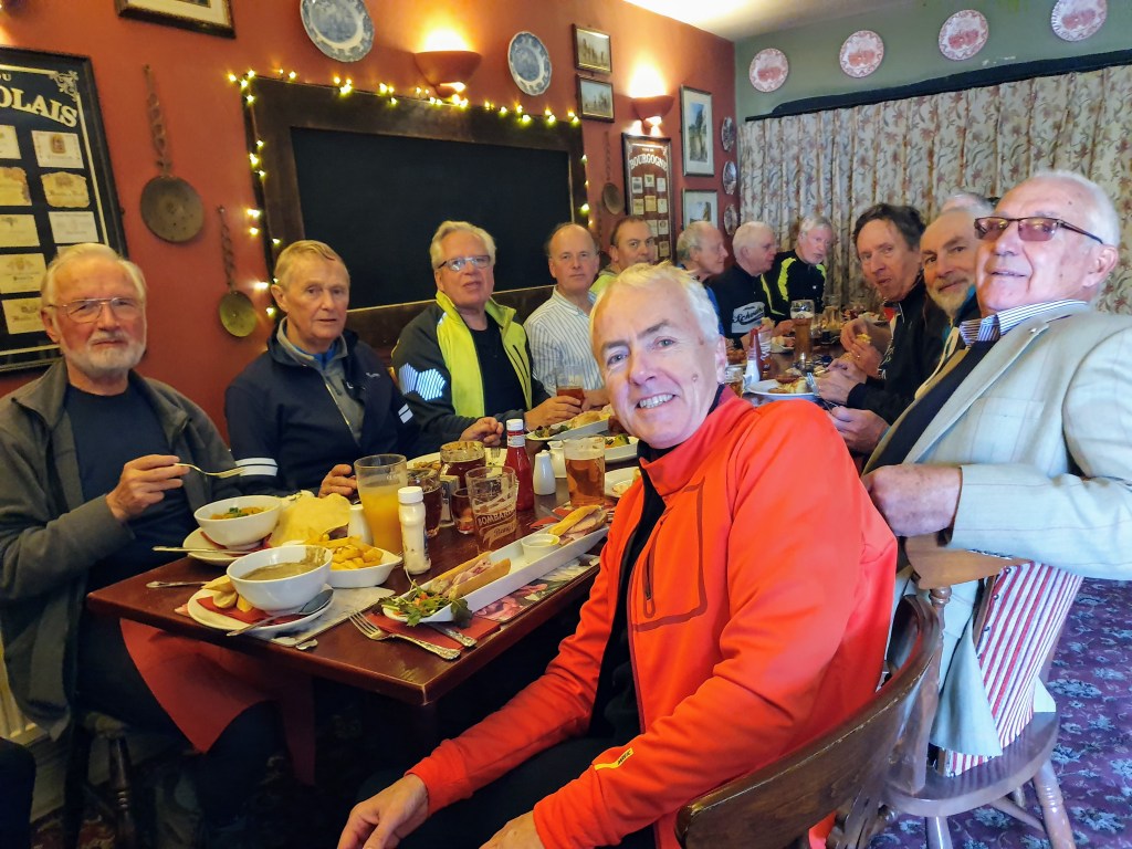 A puncture in Keith’s rear tyre entailed a small delay but, with Howard’s help, this was soon mended and we were underway once more, arriving back at the Fleece soon after 1 o’clock.